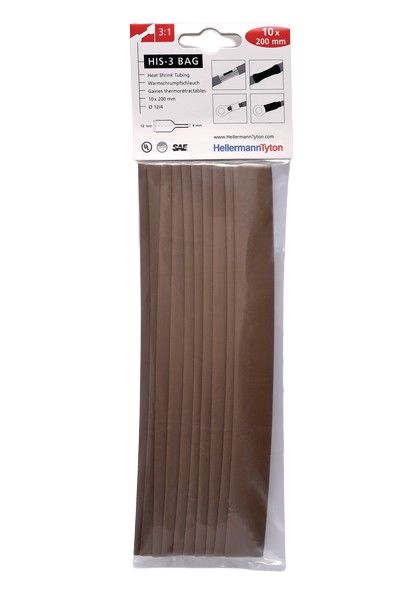 This is Heat Shrink Tube Brown 12mm Sleeve Dia. x 200mm Length 3:1 Ratio HIS-3 BAG Series manufactured by HellermannTyton. The manufacturer part number is 308-31214 HIS-3-BAG-12/4-PO-X-BN. Its adhesive is lined no . The product complies with all safety standards, such as ul. It has a 12.7mm diameter. The product has -55 → +135 °c of operating temperature range. The product his-3 bag, is a highly preferred choice for users. It has a decent brown colour. The product is made from highly stable and reliable cross linked polyolefin. It is halogen free no . This heat shrink sleeve offers extreme flexibility and suit various settings. It is flame retardant yes . Moreover, its overall shrunk diameter is 4mm . The sleeve has a 200mm length. Its shrink ratio is about 3:1 .