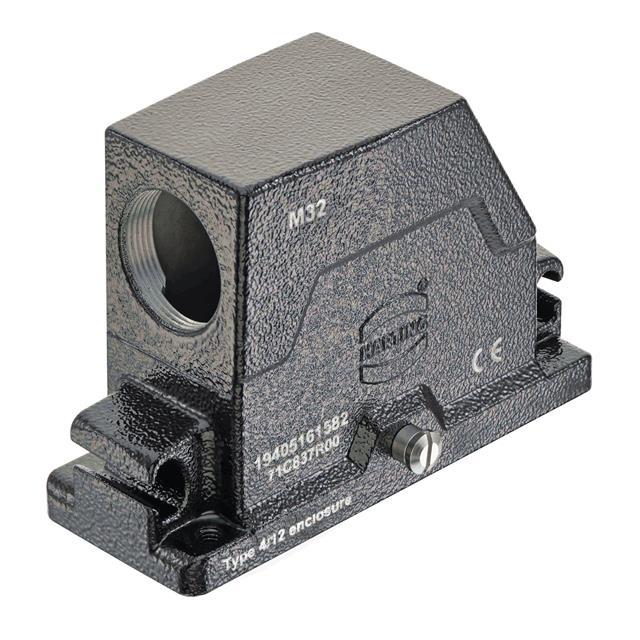 This is manufactured by HARTING. The manufacturer part number is 19405161582. Additionally, the product is designed with side entry Style. It is assigned with possible HTSUS value of 8538.90.8180. The product is rohs3 compliant. It has a typical thread size of m32. The product has -40°c ~ 125°c operating temperature range. Its typical moisture sensitivity level is 1 (unlimited). The product's housing has finished with a rugged powder coated. It has an integral black housing colour. It is shipped in bulk package . hood Connector type offer robust functionality. It has a long 11 weeks standard lead time. The product also features robust aluminum, die cast housing material. It is IP rated with ip65/ip68/ip6k9k - dust tight, water resistant, waterproof. The product han® hpr, is a highly preferred choice for users. Lock Type & Location Information: locking clip (1) on base bottom. The product is available in 16hpr size. The product is designated with the ear99 code number.