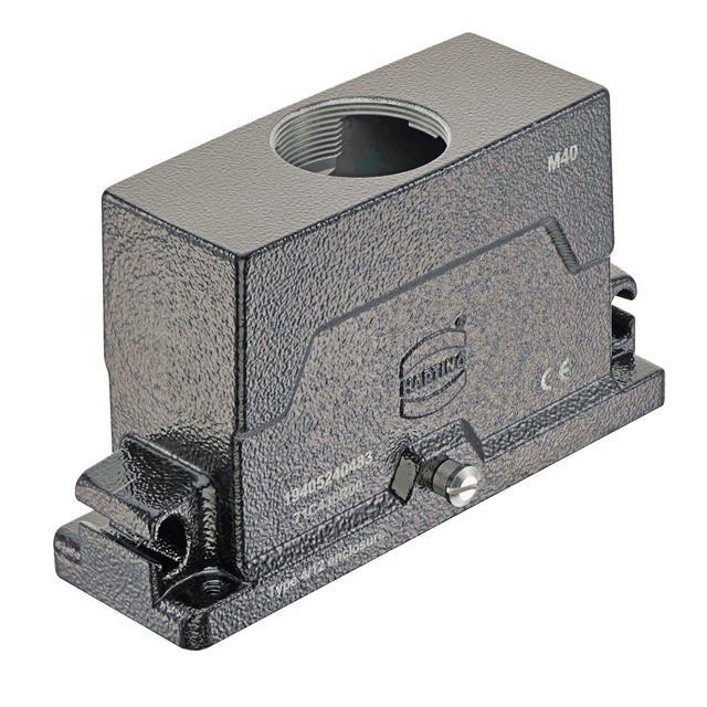This is manufactured by HARTING. The manufacturer part number is 19405240483. Additionally, the product is designed with top entry Style. It is assigned with possible HTSUS value of 8538.90.8180. The product is rohs3 compliant. It has a typical thread size of m40. The product has -40°c ~ 125°c operating temperature range. Its typical moisture sensitivity level is 1 (unlimited). The product's housing has finished with a rugged powder coated. In addition, it is reach unaffected. It has an integral black housing colour. It is shipped in bulk package . hood Connector type offer robust functionality. It has a long 11 weeks standard lead time. The product also features robust aluminum, die cast housing material. It is IP rated with ip65/ip68/ip69k - dust tight, water resistant, waterproof. The product han® hpr, is a highly preferred choice for users. Lock Type & Location Information: locking clip (1) on base bottom. The product is available in 24hpr size. The product is designated with the ear99 code number.