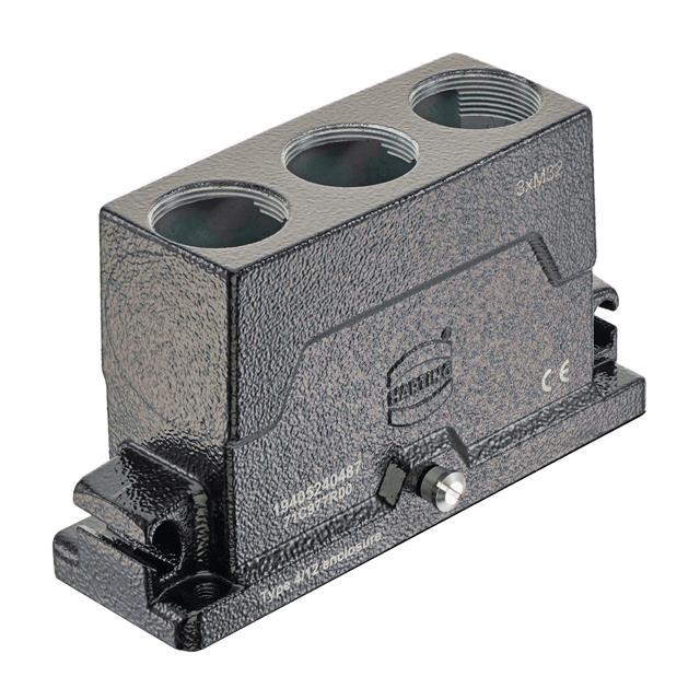 This is manufactured by HARTING. The manufacturer part number is 19405240487. Additionally, the product is designed with top entry, triple Style. It is assigned with possible HTSUS value of 8538.90.8180. The product is rohs3 compliant. It has a typical thread size of m32. The product has -40°c ~ 125°c operating temperature range. Its typical moisture sensitivity level is 1 (unlimited). The product's housing has finished with a rugged powder coated. It has an integral black housing colour. It is shipped in bulk package . hood Connector type offer robust functionality. It has a long 11 weeks standard lead time. The product also features robust aluminum, die cast housing material. It is IP rated with ip65/ip68/ip6k9k - dust tight, water resistant, waterproof. The product han® hpr, is a highly preferred choice for users. Lock Type & Location Information: locking clip (1) on base bottom. The product is available in 24hpr size. The product is designated with the ear99 code number.