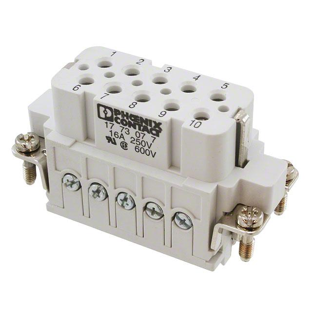 This is manufactured by Phoenix Contact. The manufacturer part number is 1773077. It is assigned with possible HTSUS value of 8536.69.8000. The product is rohs compliant. Moreover, it has screw terminal style. The product also features robust polyamide (pa), nylon housing material. The product has -40°c ~ 125°c operating temperature range. The product carries possible position value of 10. Moreover, the product has a nominal 600v voltage rating. It carries ul94 v-0 of material flammability rating. It is shipped in bulk package . In addition, female is the available "Gender" of the product. insert Connector type offer robust functionality. Furthermore, the product is galvanized with excellent silver contact finishing. Its typical moisture sensitivity level is 1 (unlimited). The product is available in d15 size. The product heavycon® a10, is a highly preferred choice for users. The product is designated with the ear99 code number. The product is made from sturdy copper alloy materials.