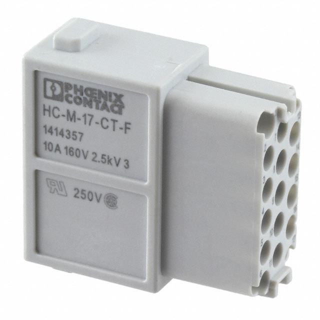 This is manufactured by Phoenix Contact. The manufacturer part number is 1414357. The product has a current rating of 10a. The high-quality silver is used as contact plating material. It is IP rated with ip54. In addition, female is the available "Gender" of the product. Moreover, the product has a nominal 160 v voltage rating. While the pole has 17p format. It allows crimp termination method. It comes in 3 of rows. The product hc-m-17, is a highly preferred choice for users. The product contains 17 contacts. It comes in connector module configuration. The product is made from sturdy copper alloy materials. It is assigned with possible HTSUS value of 8536.69.8000. The product is rohs3 compliant. Moreover, it has crimp terminal style. The product also features robust polycarbonate (pc) housing material. The product has -40°c ~ 125°c operating temperature range. The product carries possible position value of 17. In addition, it is reach unaffected. It carries ul94 v-0 of material flammability rating. The phoenix contact's product offers user-desired applications. Moreover, the product has a nominal 160v voltage rating. module without contacts Connector type offer robust functionality. Its typical moisture sensitivity level is 1 (unlimited). It has typical contact type of ck 1.6-ed. It has a long 8 weeks standard lead time. Additionally, the product's output is 14a. It has a classic gray colour. The product heavycon® m, is a highly preferred choice for users. In addition, bulk is the available packaging type of the product. The product is designated with the ear99 code number.