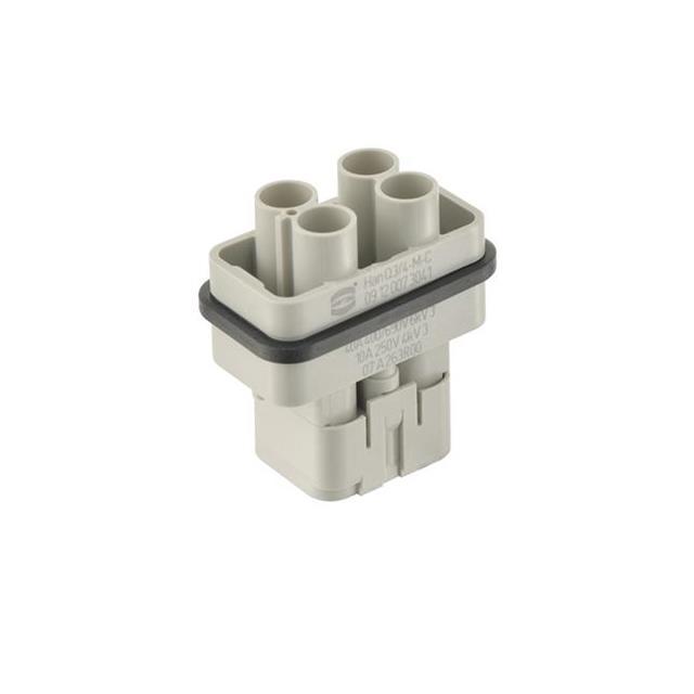 This is manufactured by HARTING. The manufacturer part number is 09120073041. It is assigned with possible HTSUS value of 8536.69.8000. The product is rohs3 compliant. Moreover, it has crimp terminal style. The product also features robust polycarbonate (pc) housing material. The product has -40°c ~ 125°c operating temperature range. The product carries possible position value of 3+4+ground. In addition, it is reach unaffected. It carries ul94 v-0 of material flammability rating. It is shipped in bulk package . In addition, male is the available "Gender" of the product. insert without contacts Connector type offer robust functionality. Its typical moisture sensitivity level is 1 (unlimited). It has a long 8 weeks standard lead time. It has a classic gray colour. The product han® q, is a highly preferred choice for users. Moreover, it corresponds to 09120073, a base product number of the product. The product is designated with the ear99 code number.