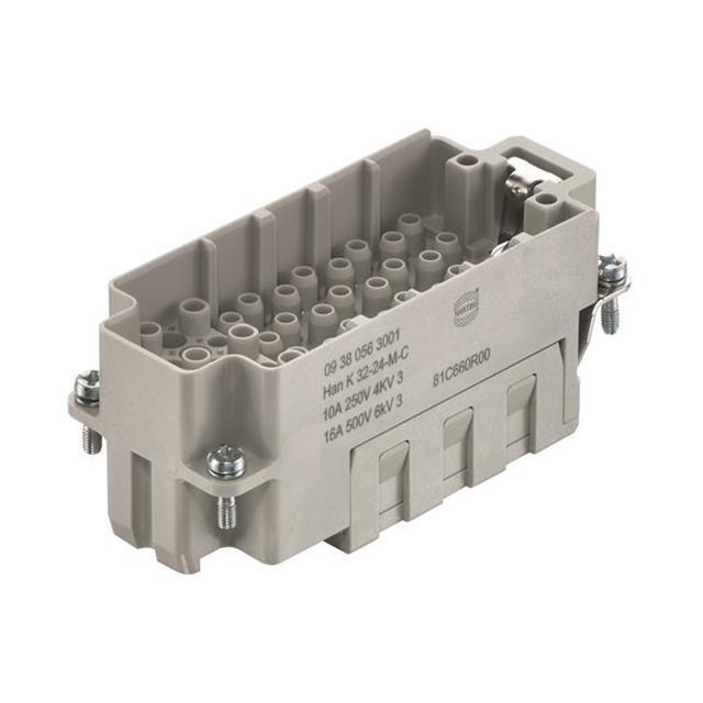 This is manufactured by HARTING. The manufacturer part number is 09380563001. It is assigned with possible HTSUS value of 8536.69.8000. The product is rohs3 compliant. Moreover, it has crimp terminal style. The product also features robust polycarbonate (pc) housing material. The product has -40°c ~ 125°c operating temperature range. The product carries possible position value of 24+32+ground. It carries ul94 v-0 of material flammability rating. The harting's product offers user-desired applications. Moreover, the product has a nominal 250v, 500v voltage rating. In addition, male is the available "Gender" of the product. insert without contacts Connector type offer robust functionality. Its typical moisture sensitivity level is 1 (unlimited). It has typical contact type of han® d, han® e. The product is available in 16b size. It has a long 15 weeks standard lead time. Additionally, the product's output is 10a, 16a. It has a classic gray colour. The product han-com®, is a highly preferred choice for users. In addition, bulk is the available packaging type of the product. The product is designated with the ear99 code number.