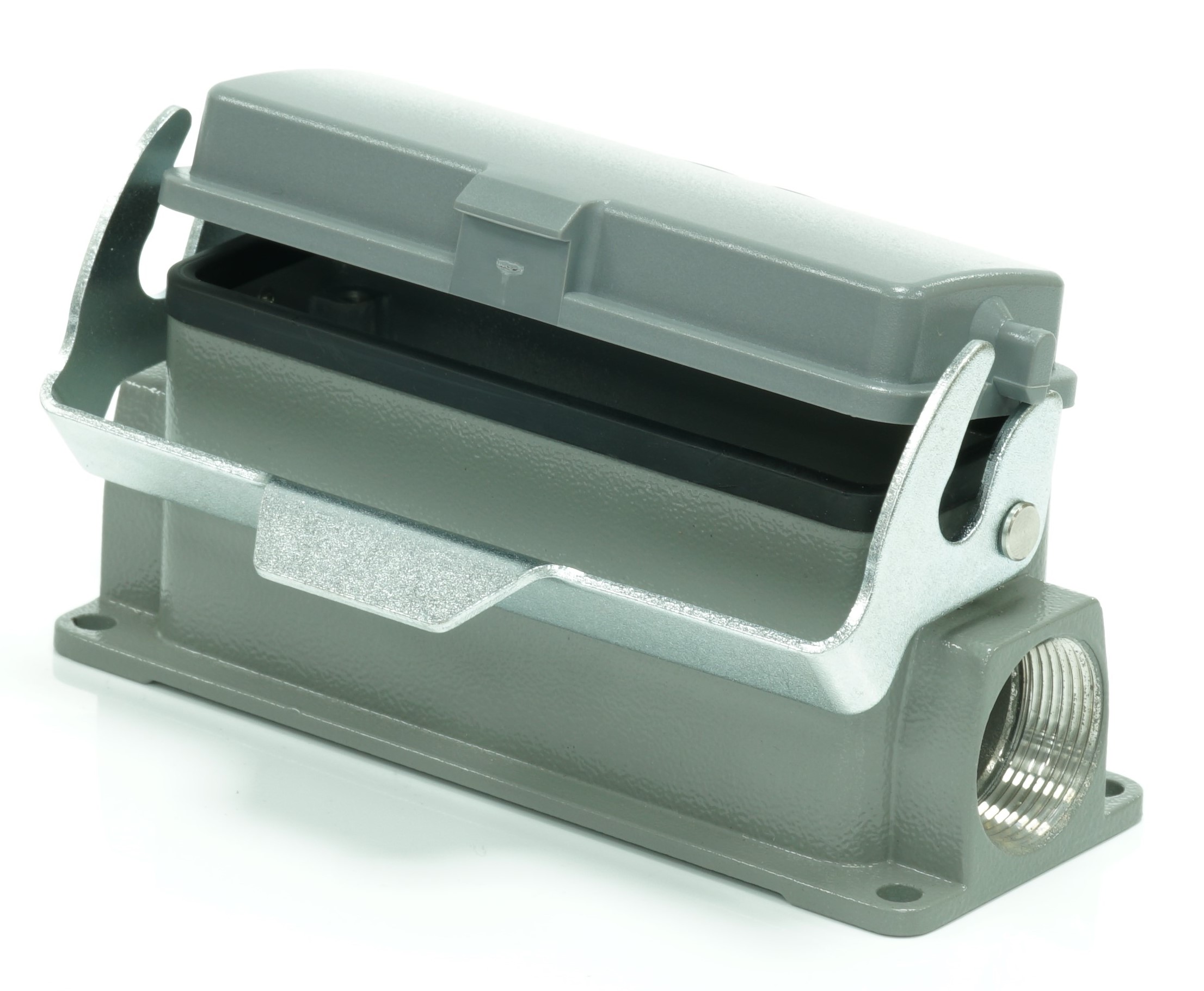 This is Side Entry Heavy Duty Power Connector Housing Surface Mount manufactured by RS PRO. The manufacturer part number is 208-4007. Its cable entry is from side angle . The product is available in surface mount configuration. It is IP rated with ip65. The product rs-h24b, is a highly preferred choice for users. It has side entry body orientation. It has a typical thread size of pg21. Whereas, the rs-h24b is the manufacture's size code. The product is highly suitable for rs pro heavy duty inserts and pg or m style cable glands. It includes 1 levers . It comes in connector housing configuration.