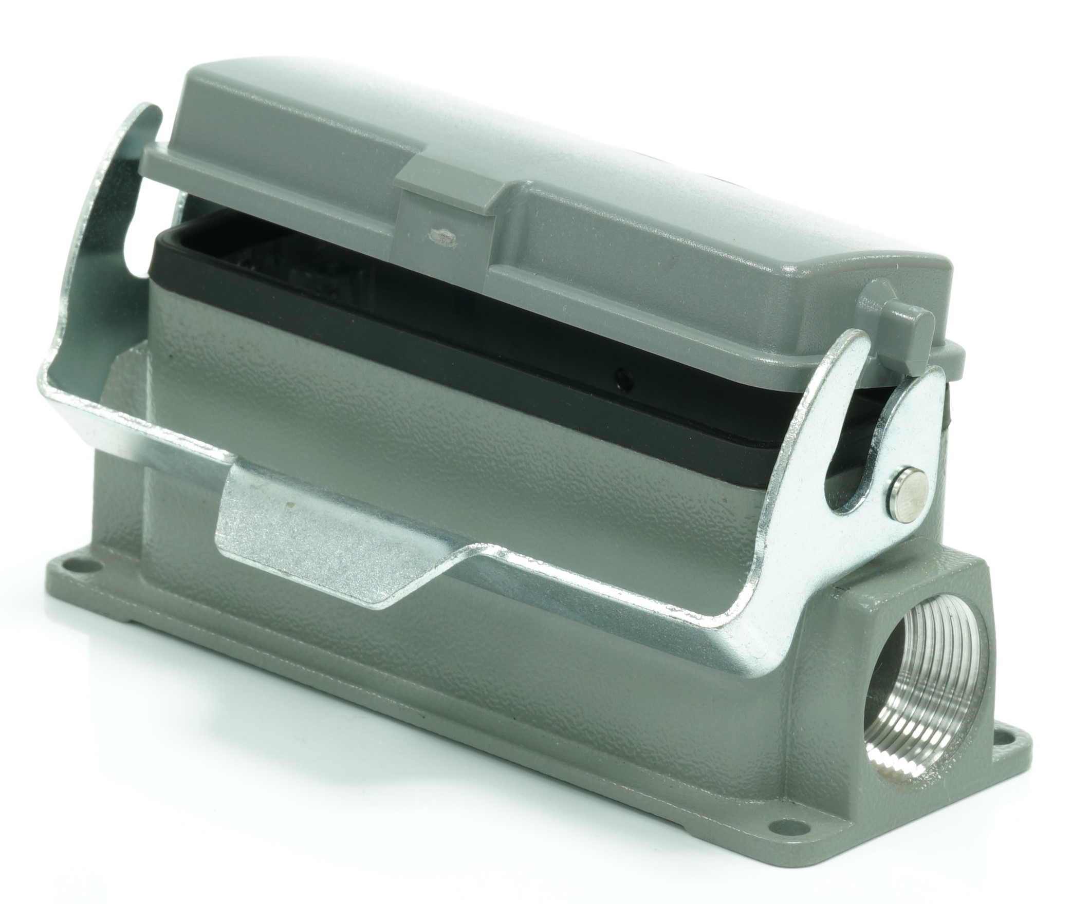 This is Side Entry Heavy Duty Power Connector Housing Surface Mount manufactured by RS PRO. The manufacturer part number is 208-4009. Its cable entry is from side angle . The product is available in surface mount configuration. It is IP rated with ip65. The product rs-h24b, is a highly preferred choice for users. It has side entry body orientation. It has a typical thread size of pg21. Whereas, the rs-h24b is the manufacture's size code. The product is highly suitable for rs pro heavy duty inserts and pg or m style cable glands. It includes 1 levers . It comes in connector housing configuration.