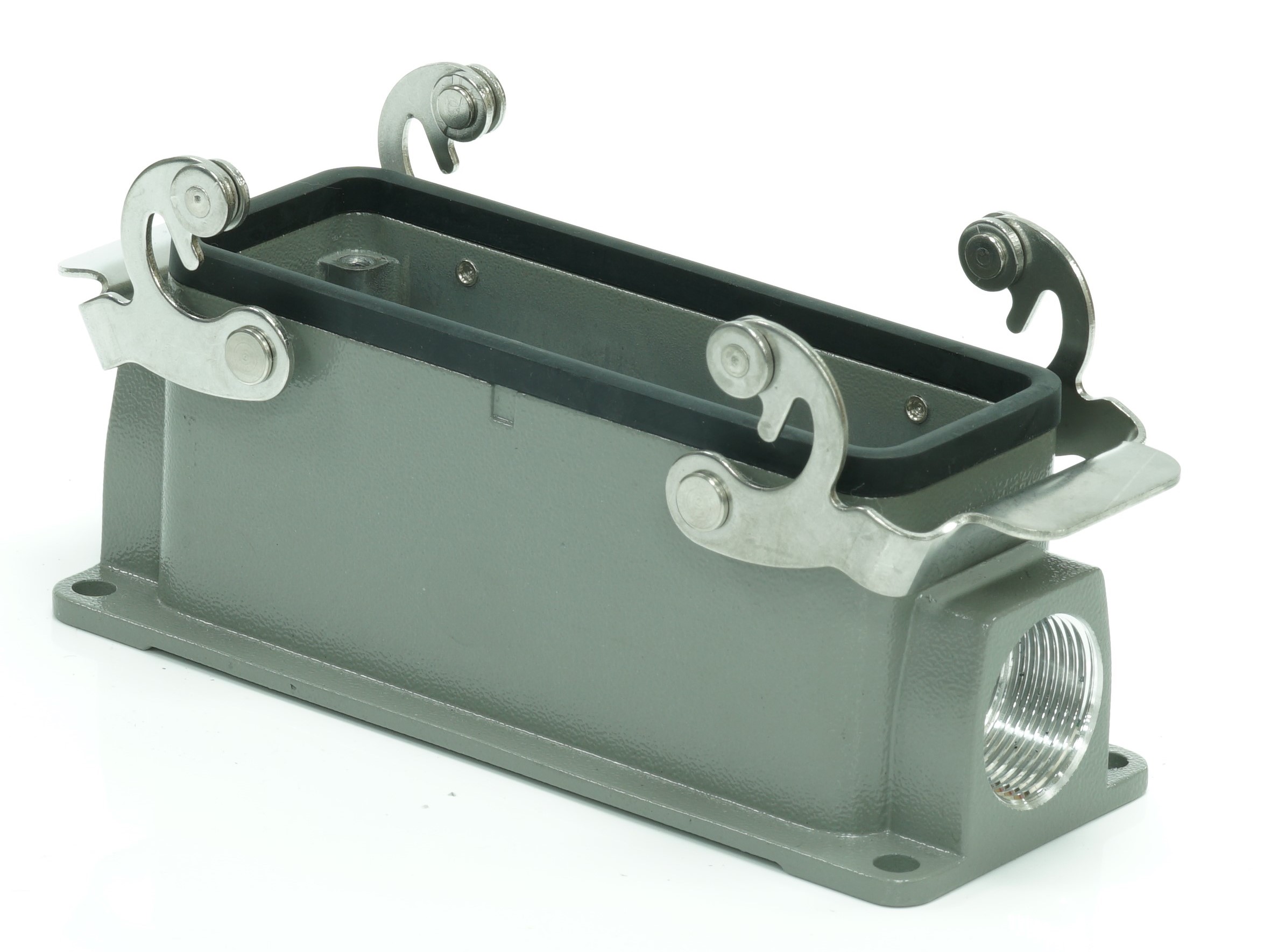 This is Side Entry Heavy Duty Power Connector Housing Surface Mount manufactured by RS PRO. The manufacturer part number is 208-4012. Its cable entry is from side angle . The product is available in surface mount configuration. It is IP rated with ip65. The product rs-h24b, is a highly preferred choice for users. It has side entry body orientation. It has a typical thread size of m25. The product is highly suitable for rs pro heavy duty inserts and pg or m style cable glands. It includes 2 levers . It comes in connector housing configuration.
