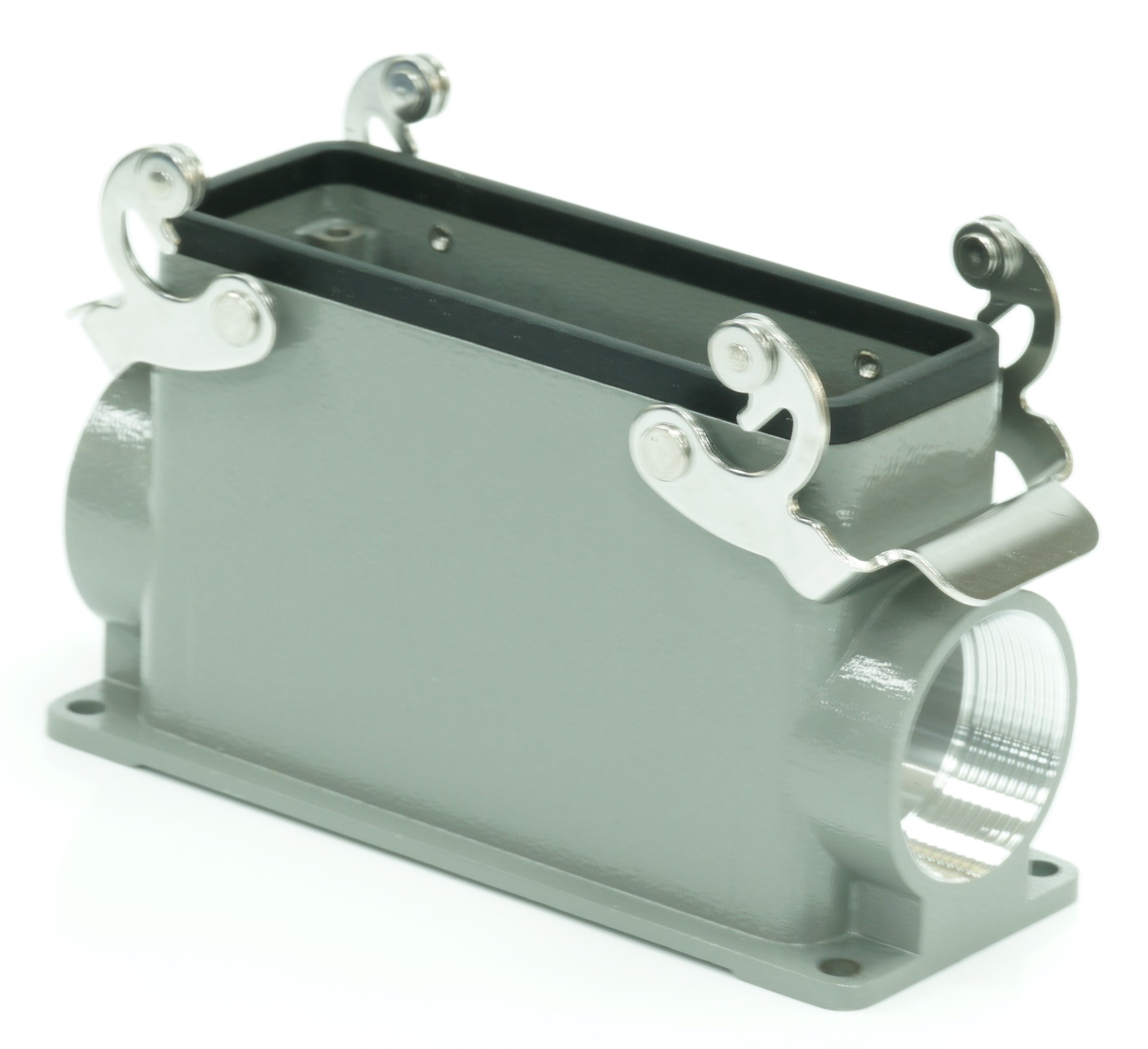 This is Side Entry Heavy Duty Power Connector Housing Surface Mount manufactured by RS PRO. The manufacturer part number is 208-4042. Its cable entry is from side angle . The product is available in surface mount configuration. It is IP rated with ip65. The product rs-h24b, is a highly preferred choice for users. It has side entry body orientation. It has a typical thread size of pg29. Whereas, the rs-h24b is the manufacture's size code. The product is highly suitable for rs pro heavy duty inserts and pg or m style cable glands. It includes 2 levers . It comes in connector housing configuration.