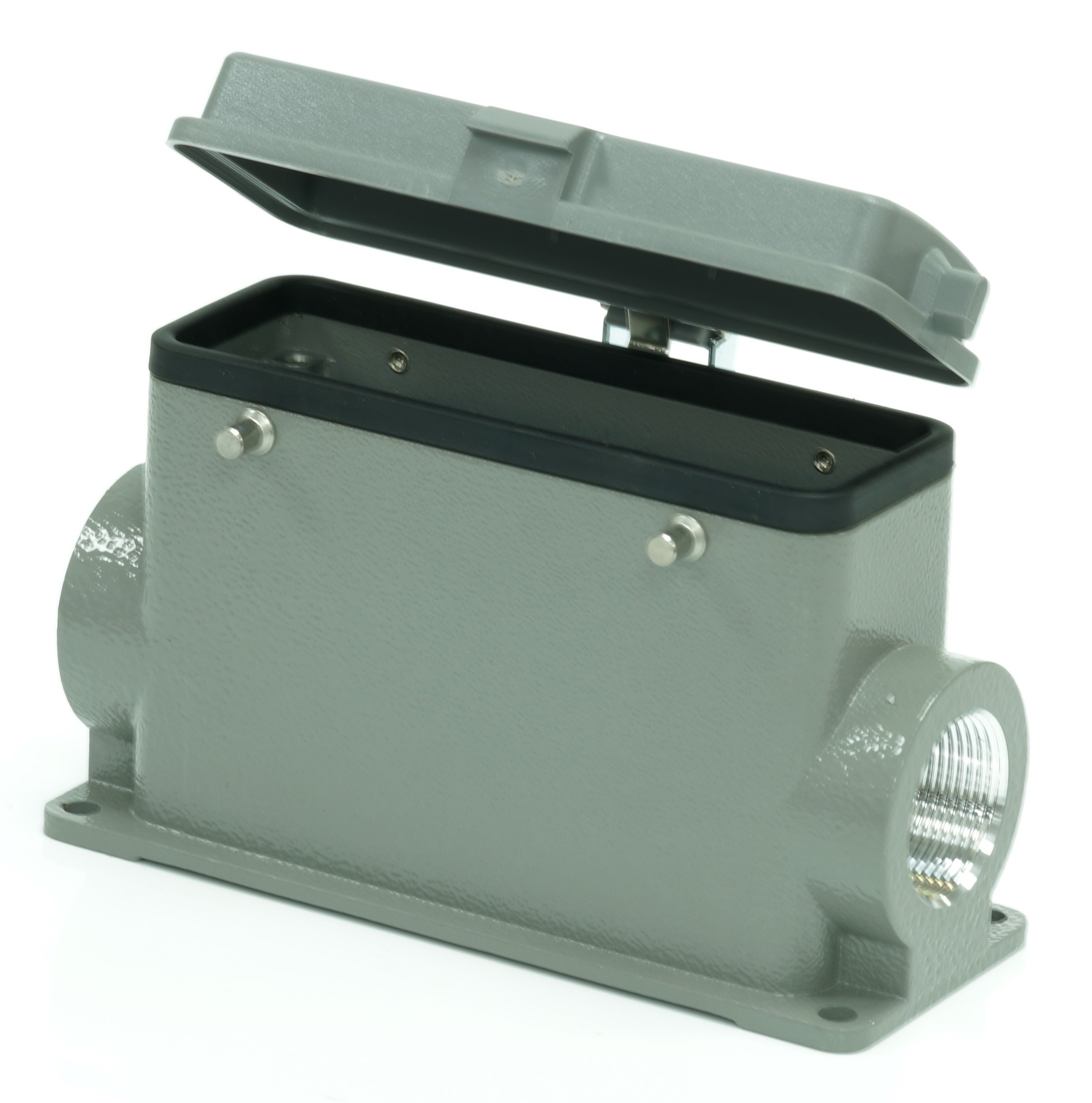 This is Side Entry Heavy Duty Power Connector Housing Surface Mount manufactured by RS PRO. The manufacturer part number is 208-4052. Its cable entry is from side angle . The product is available in surface mount configuration. It is IP rated with ip65. The product rs-h24b, is a highly preferred choice for users. It has side entry body orientation. It has a typical thread size of pg21. The product is highly suitable for rs pro heavy duty inserts and pg or m style cable glands. It includes 4 levers . It comes in connector housing configuration.