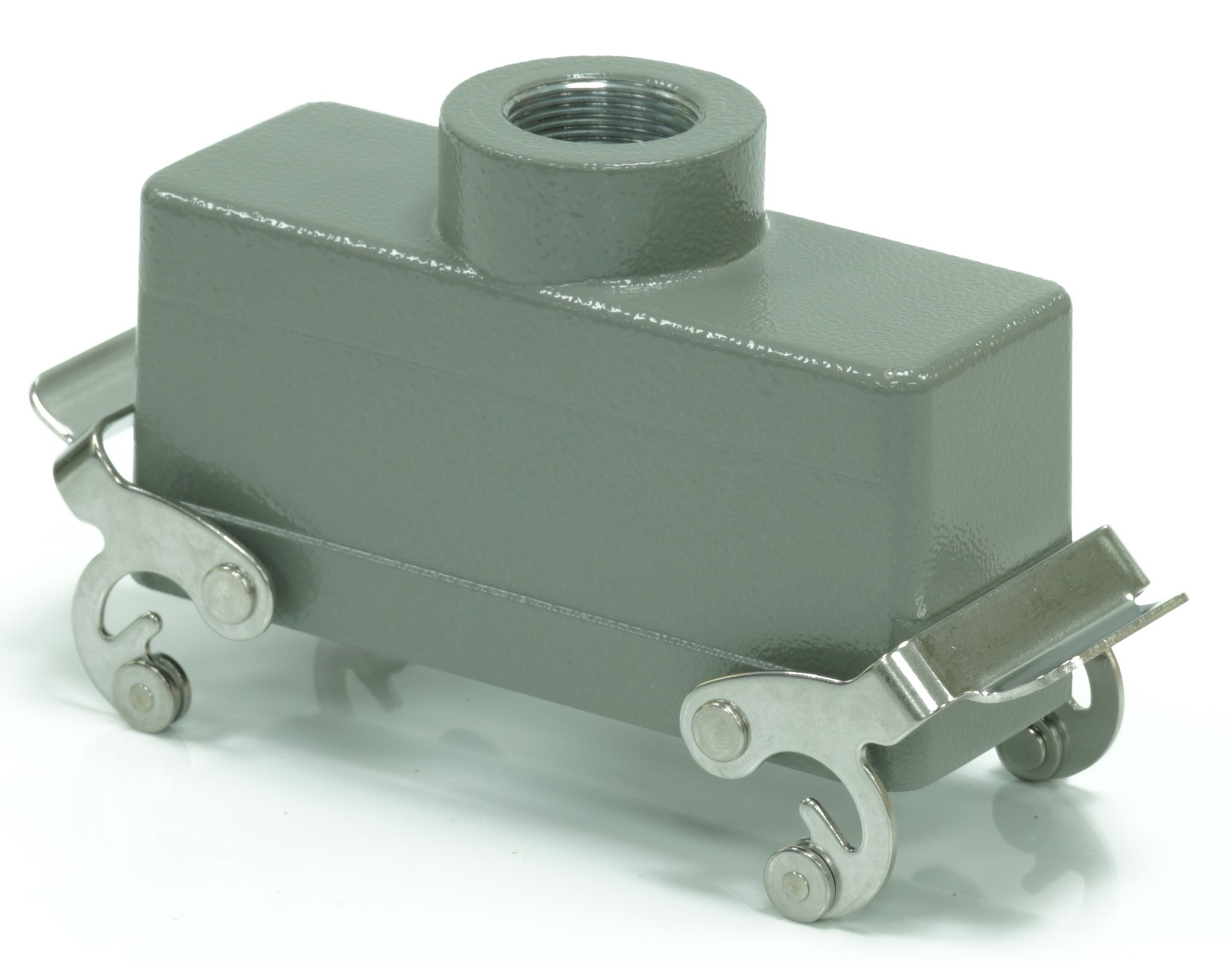This is Top Entry Heavy Duty Power Connector Housing Top Mount manufactured by RS PRO. The manufacturer part number is 208-4064. Its cable entry is from top angle . The product is available in top mount configuration. It is IP rated with ip65. The product rs-h24b, is a highly preferred choice for users. It has top entry body orientation. It has a typical thread size of m25. The product is highly suitable for rs pro heavy duty inserts and pg or m style cable glands. It includes 2 levers . It comes in connector hood configuration.