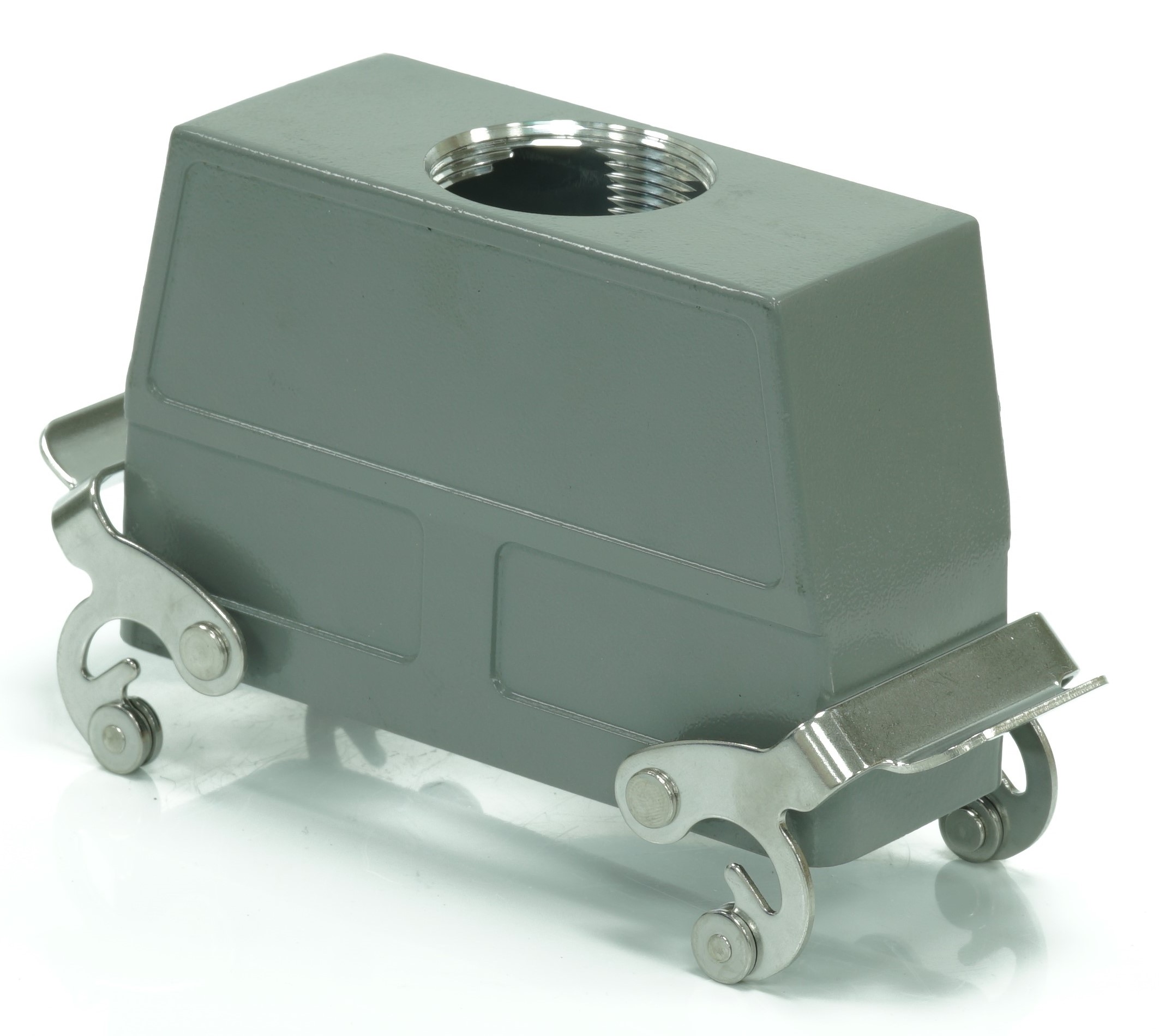 This is Top Entry Heavy Duty Power Connector Housing Top Mount manufactured by RS PRO. The manufacturer part number is 208-4081. Its cable entry is from top angle . The product is available in top mount configuration. It is IP rated with ip65. The product rs-h24b, is a highly preferred choice for users. It has top entry body orientation. It has a typical thread size of pg29. The product is highly suitable for rs pro heavy duty inserts and pg or m style cable glands. It includes 2 levers . It comes in connector hood configuration.