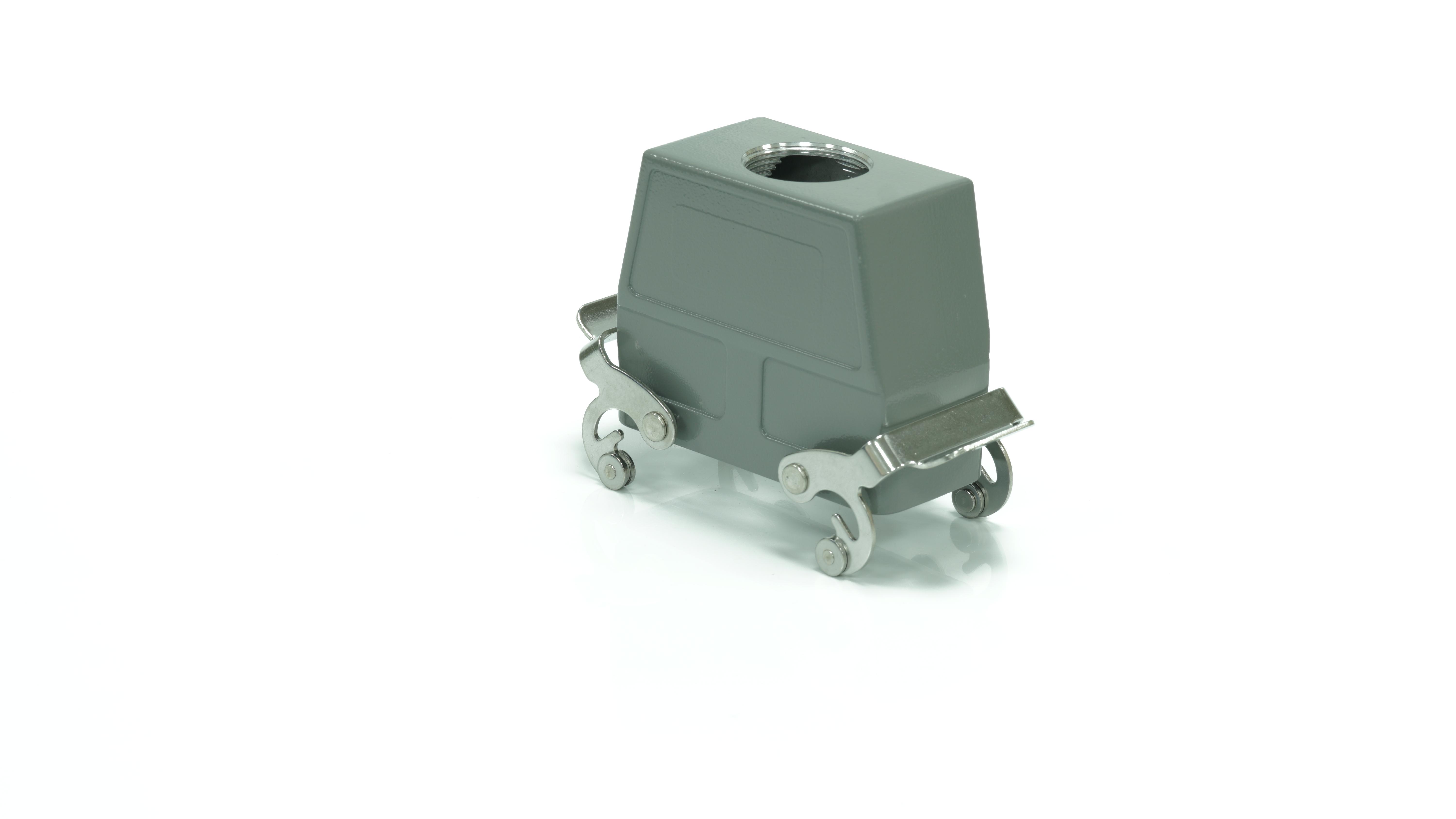 This is Top Entry Heavy Duty Power Connector Housing Top Mount manufactured by RS PRO. The manufacturer part number is 208-3949. Its cable entry is from top angle . The product is available in top mount configuration. It is IP rated with ip65. The product rs-h16b, is a highly preferred choice for users. It has top entry body orientation. It has a typical thread size of m25. Whereas, the rs-h16b is the manufacture's size code. The product is highly suitable for rs pro heavy duty inserts and pg or m style cable glands. It includes 2 levers . It comes in connector hood configuration.