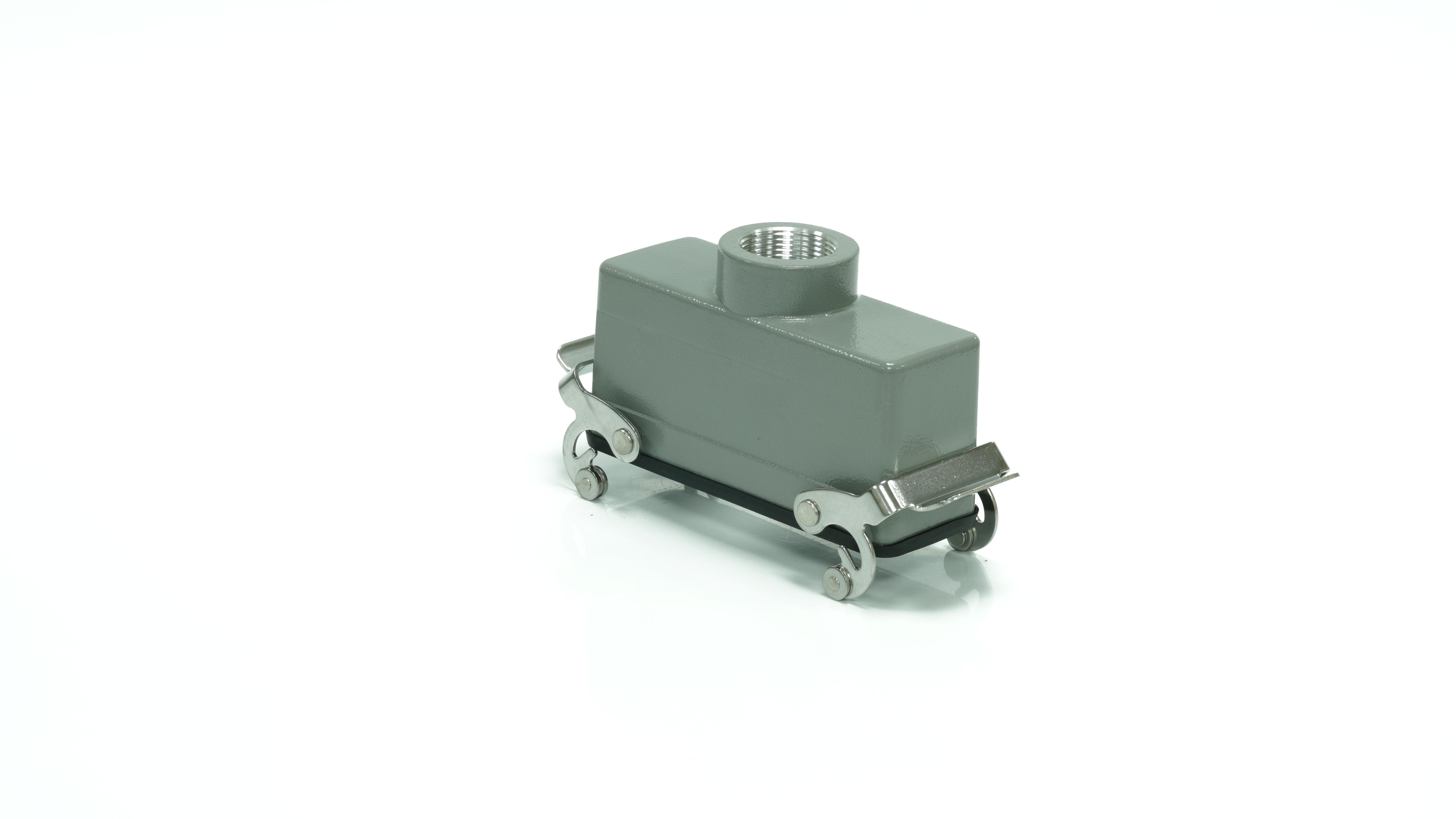 This is Top Entry Heavy Duty Power Connector Housing Cable manufactured by RS PRO. The manufacturer part number is 208-3970. Its cable entry is from top angle . The product is available in cable configuration. It is IP rated with ip65. The product rs-h24b, is a highly preferred choice for users. It has top entry body orientation. It has a typical thread size of pg21. The product is highly suitable for rs pro heavy duty inserts and pg or m style cable glands. It includes 2 levers . It comes in cable to cable housing configuration.
