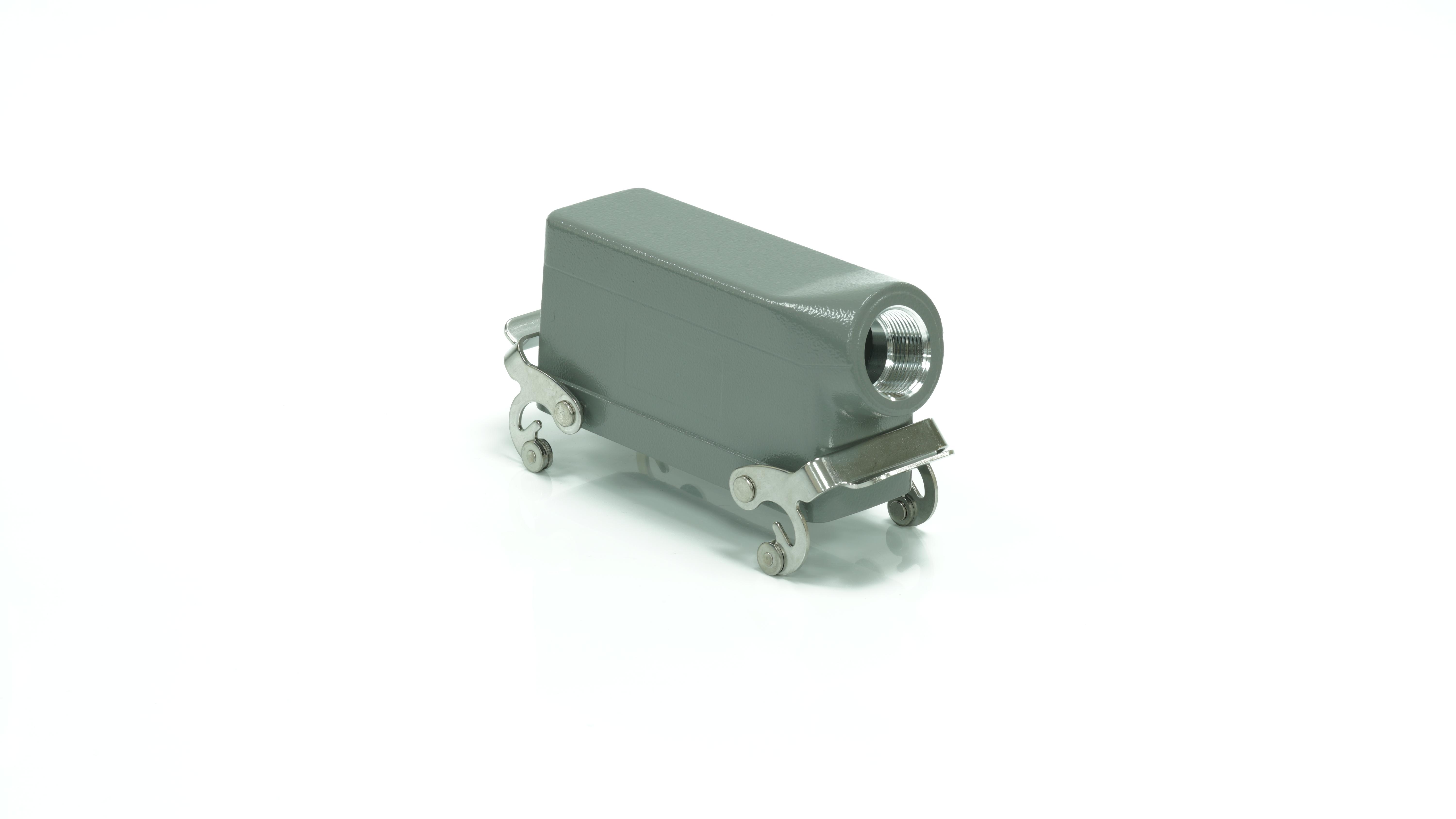 This is Side Entry Heavy Duty Power Connector Housing Side Mount manufactured by RS PRO. The manufacturer part number is 208-3983. Its cable entry is from side angle . The product is available in side mount configuration. It is IP rated with ip65. The product rs-h24b, is a highly preferred choice for users. It has side entry body orientation. It has a typical thread size of m25. Whereas, the rs-h24b is the manufacture's size code. The product is highly suitable for rs pro heavy duty inserts and pg or m style cable glands. It includes 2 levers . It comes in connector hood configuration.