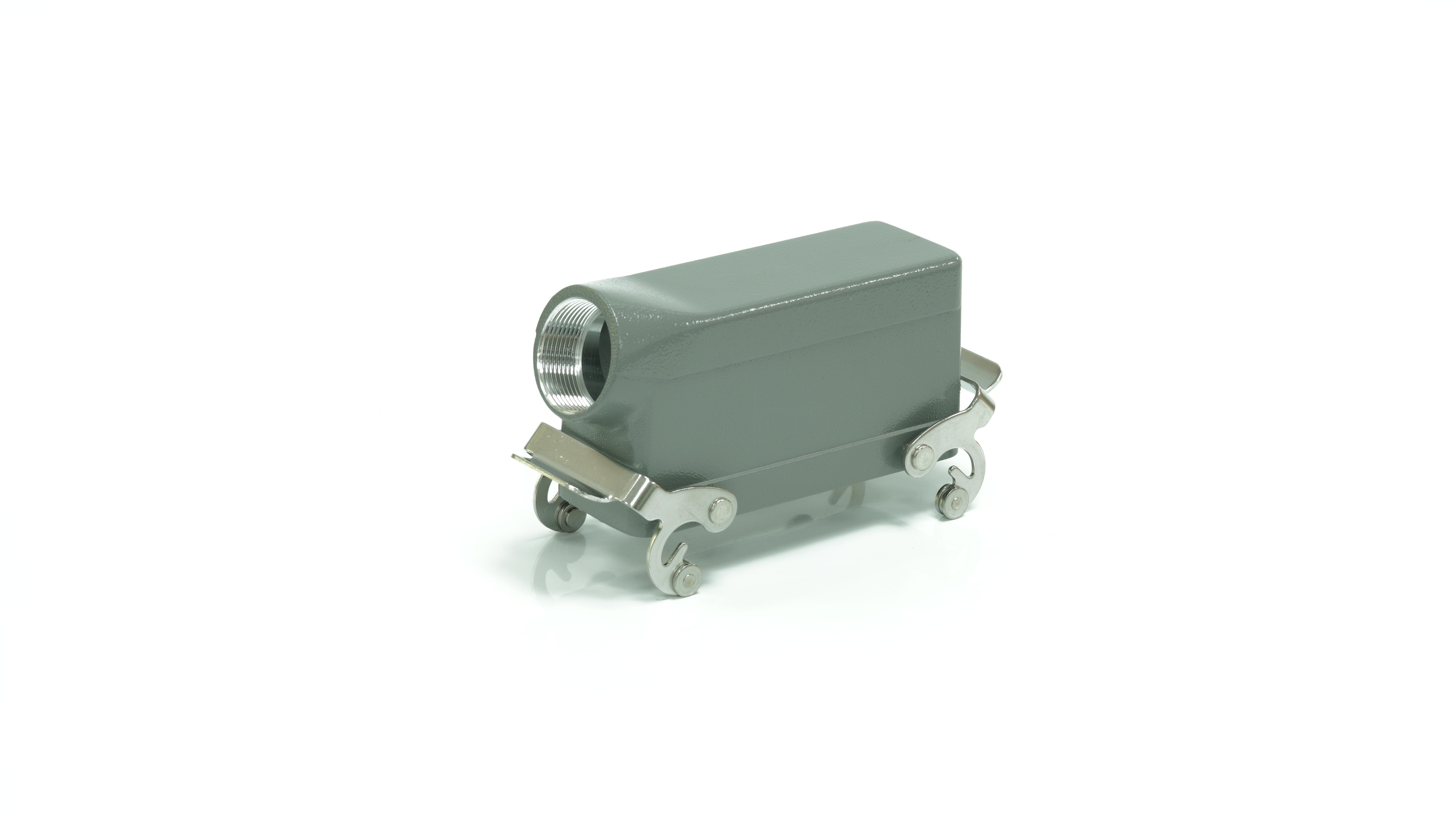 This is Side Entry Heavy Duty Power Connector Housing Side Mount manufactured by RS PRO. The manufacturer part number is 208-3985. Its cable entry is from side angle . The product is available in side mount configuration. It is IP rated with ip65. The product rs-h24b, is a highly preferred choice for users. It has side entry body orientation. It has a typical thread size of m32. Whereas, the rs-h24b is the manufacture's size code. The product is highly suitable for rs pro heavy duty inserts and pg or m style cable glands. It includes 2 levers . It comes in connector hood configuration.