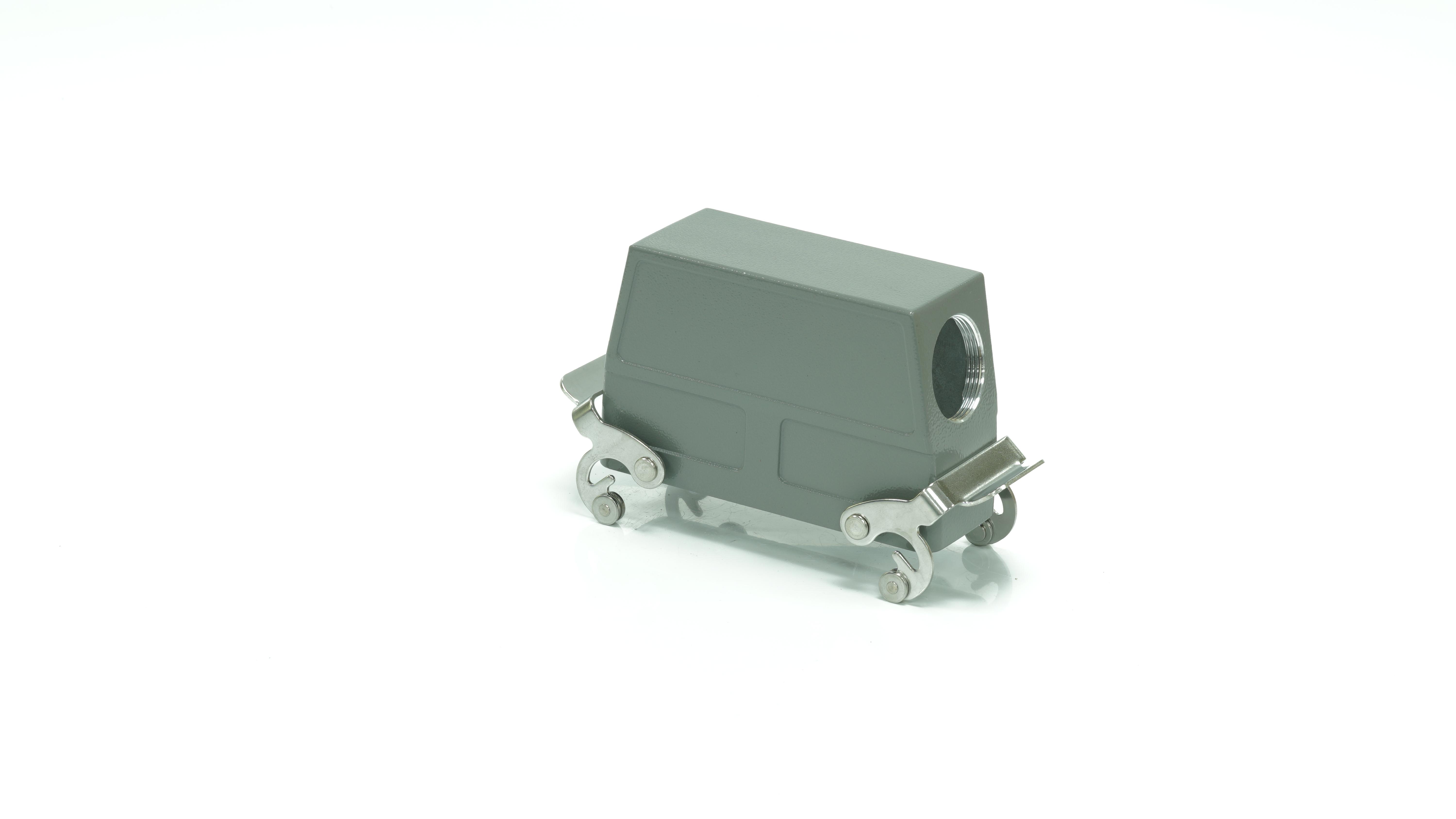 This is Side Entry Heavy Duty Power Connector Housing Side Mount manufactured by RS PRO. The manufacturer part number is 208-3995. Its cable entry is from side angle . The product is available in side mount configuration. It is IP rated with ip65. The product rs-h24b, is a highly preferred choice for users. It has side entry body orientation. It has a typical thread size of m32. Whereas, the rs-h24b is the manufacture's size code. The product is highly suitable for rs pro heavy duty inserts and pg or m style cable glands. It includes 2 levers . It comes in connector hood configuration.
