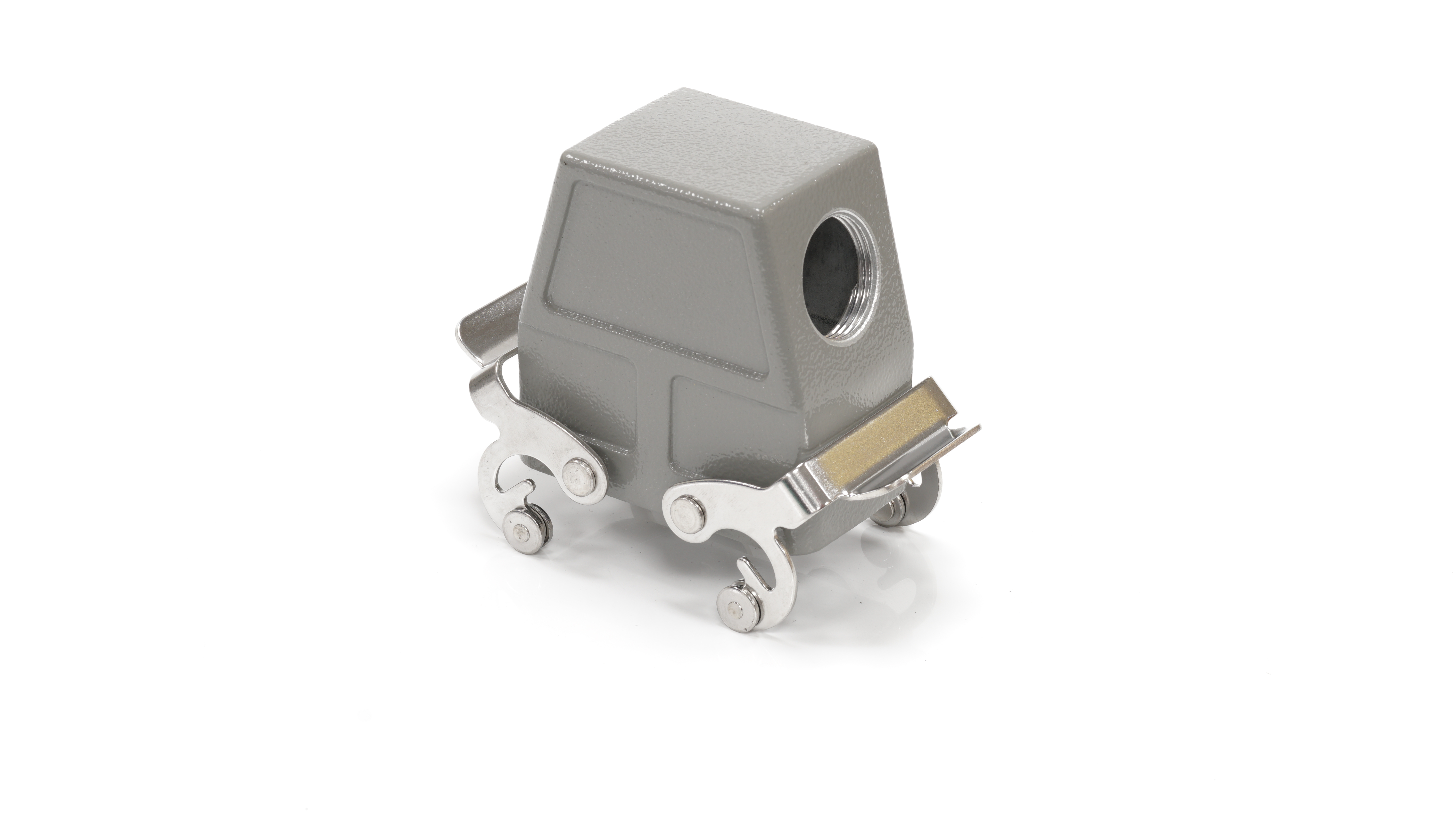 This is Side Entry Heavy Duty Power Connector Housing Side Mount manufactured by RS PRO. The manufacturer part number is 208-4777. Its cable entry is from side angle . The product is available in side mount configuration. It is IP rated with ip65. The product h10b, is a highly preferred choice for users. It has side entry body orientation. It has a typical thread size of m25. The product is highly suitable for rs pro heavy duty inserts and pg or m style cable glands. It includes 2 levers . It comes in connector hood configuration.