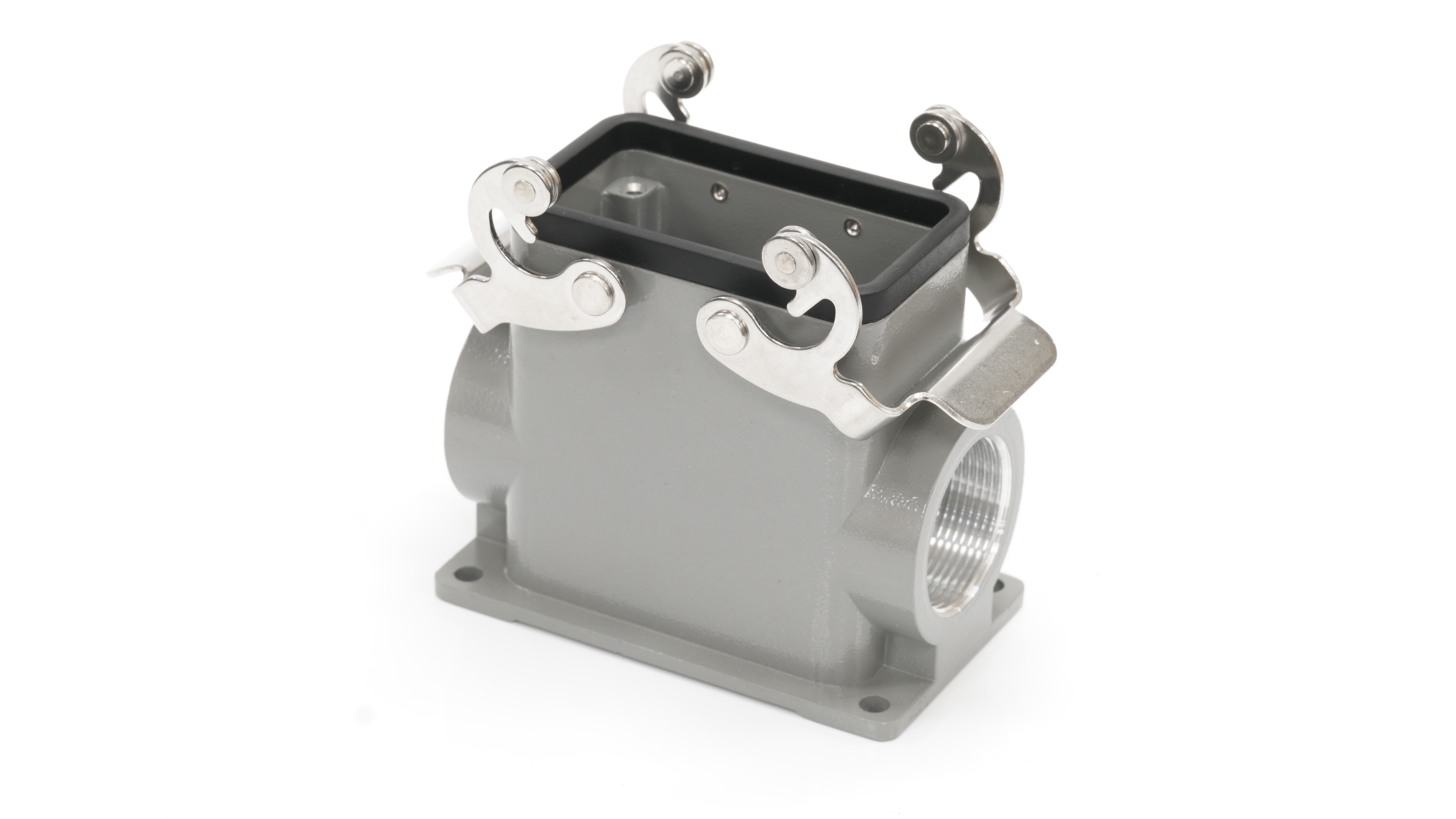 This is Side Entry Heavy Duty Power Connector Housing Surface Mount manufactured by RS PRO. The manufacturer part number is 208-4842. Its cable entry is from side angle . The product is available in surface mount configuration. It is IP rated with ip65. The product rs-h10b, is a highly preferred choice for users. It has side entry body orientation. It has a typical thread size of m32. Whereas, the rs-h10b is the manufacture's size code. The product is highly suitable for rs pro heavy duty inserts and pg or m style cable glands. It includes 2 levers . It comes in connector housing configuration.