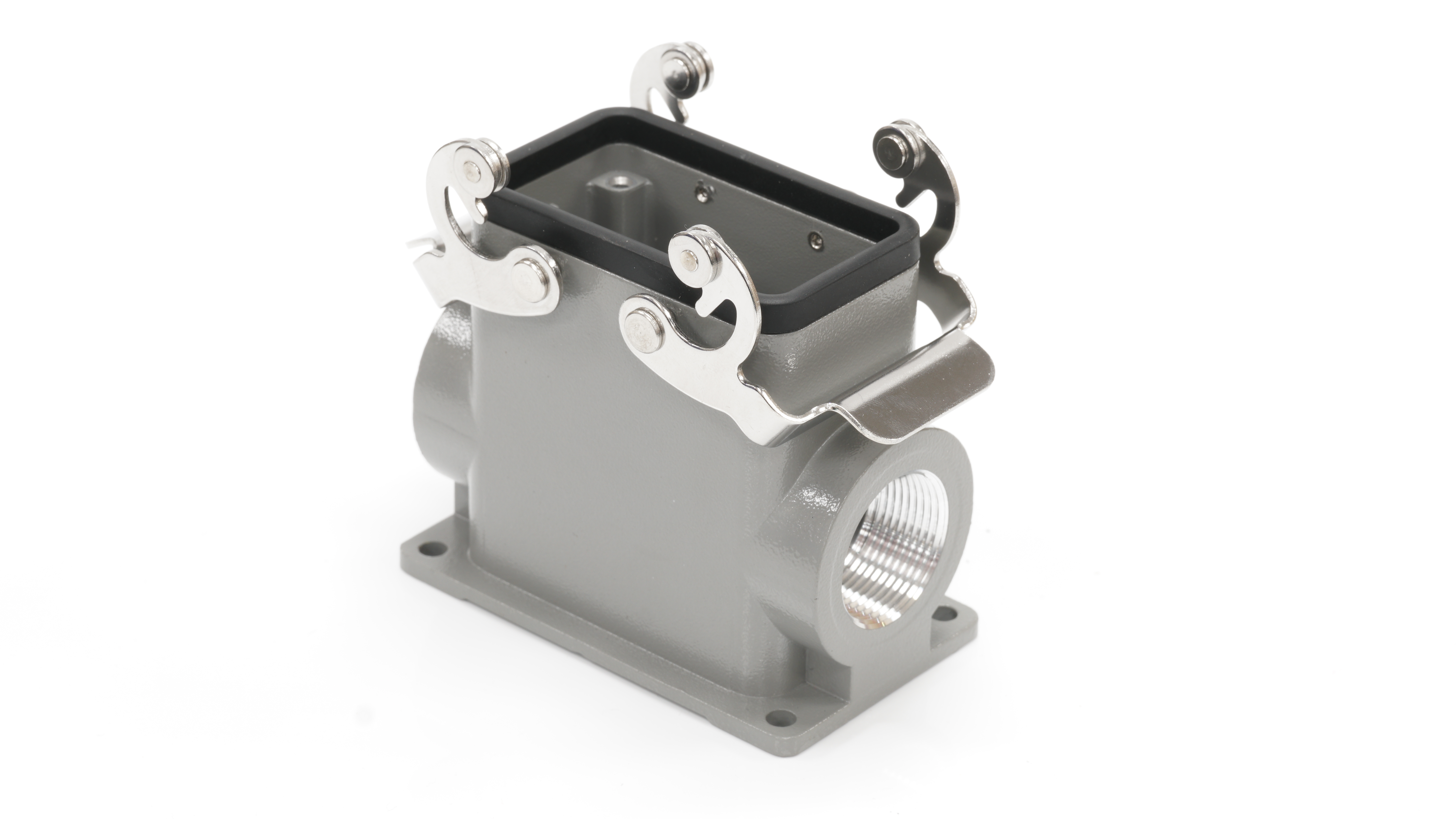 This is Side Entry Heavy Duty Power Connector Housing Surface Mount manufactured by RS PRO. The manufacturer part number is 208-4843. Its cable entry is from side angle . The product is available in surface mount configuration. It is IP rated with ip65. The product rs-h10b, is a highly preferred choice for users. It has side entry body orientation. It has a typical thread size of pg21. Whereas, the rs-h10b is the manufacture's size code. The product is highly suitable for rs pro heavy duty inserts and pg or m style cable glands. It includes 2 levers . It comes in connector housing configuration.