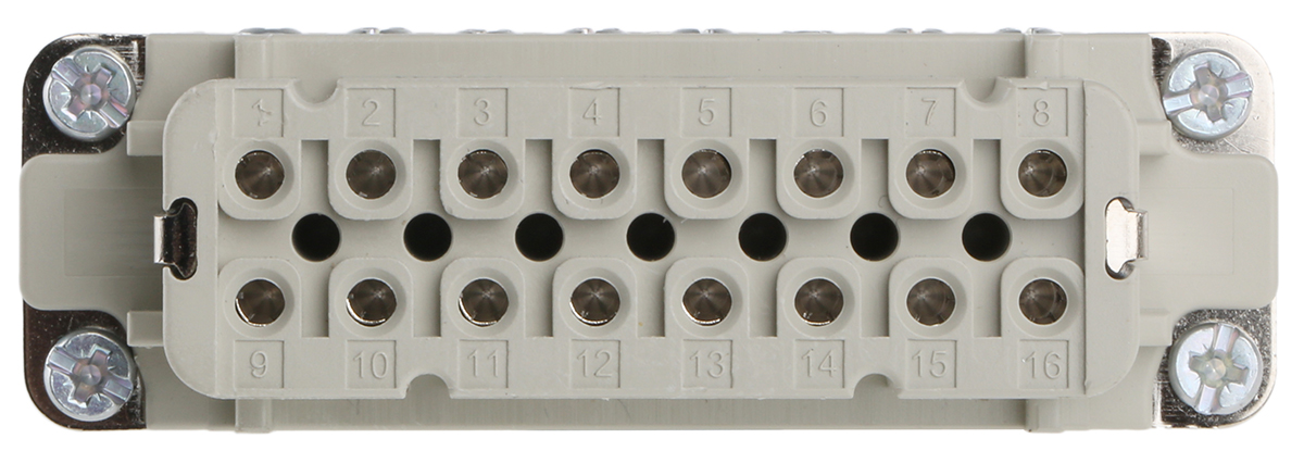 This is H-A Series Cable Mount Connector Insert Female 16 Way 14A 600 V manufactured by Epic Contact. The manufacturer part number is 10531000. The product has a current rating of 14a. The product is available in cable mount configuration. Moreover, the product has a nominal 600 v voltage rating. In addition, female is the available "Gender" of the product. It has straight body orientation. It allows screw down termination method. While the pole has 16p format. It comes in 2 of rows. The high-quality silver is used as contact plating material. The product h-a, is a highly preferred choice for users. The product contains 16 contacts. It comes in connector insert configuration. The product is made from sturdy copper alloy materials.