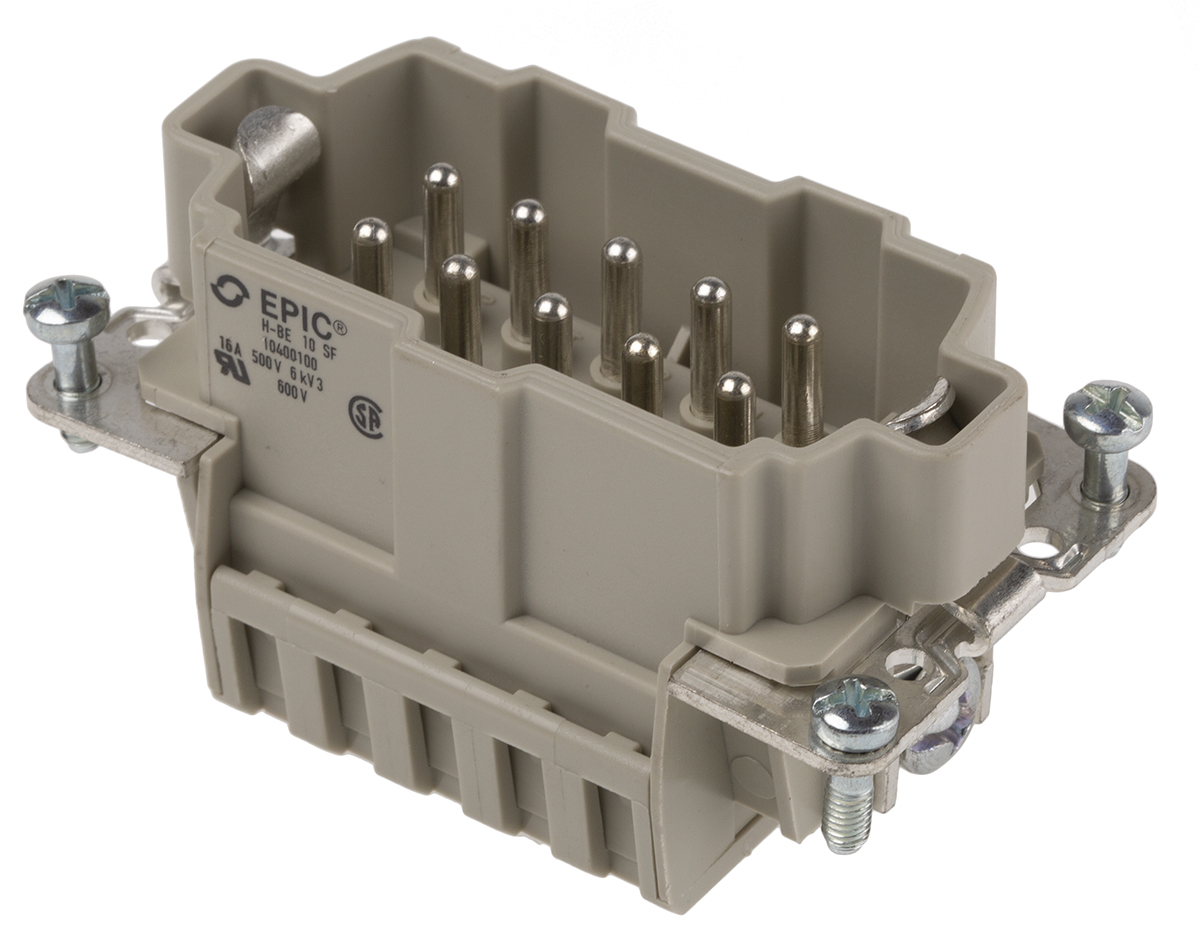 This is H-BE Series Cable Mount Connector Insert Male 10 Way 16A 600 V manufactured by Epic Contact. The manufacturer part number is 10400100. The product has a current rating of 16a. The product is available in cable mount configuration. Moreover, the product has a nominal 600 v voltage rating. In addition, male is the available "Gender" of the product. It has straight body orientation. While the pole has 10p format. It comes in 2 of rows. The high-quality silver is used as contact plating material. The product h-be, is a highly preferred choice for users. The product contains 10 contacts. It comes in connector insert configuration. The product is made from sturdy copper alloy materials.
