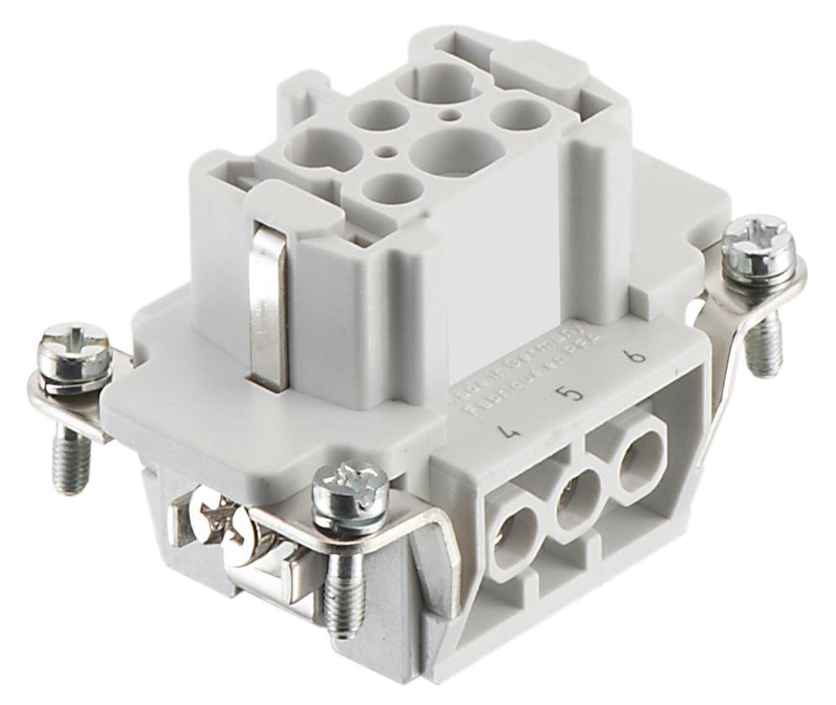 This is E Series size 6 E Connector Insert Female 7 Way 16A 500 V 600 V manufactured by RS Pro. The manufacturer part number is 171-5726. The product has a current rating of 16a. Moreover, the product has a nominal 500 v, 600 v voltage rating. In addition, female is the available "Gender" of the product. It has straight body orientation. It allows screw termination method. While the pole has 6+pe format. It features 6b range. It comes in 2 of rows. The high-quality silver is used as contact plating material. The product rs pro e, is a highly preferred choice for users. The product contains 6 contacts. It comes in connector insert configuration. The product is made from sturdy copper alloy materials.