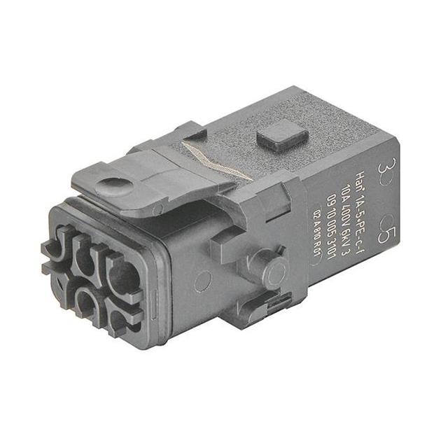 This is manufactured by HARTING. The manufacturer part number is 09100053101. The product has a current rating of 10a. It is IP rated with ip20, ip65. In addition, female is the available "Gender" of the product. Moreover, the product has a nominal 400 v voltage rating. While the pole has 5p+e format. It allows crimp termination method. It features han range. It comes in 3 of rows. The product han 1a, is a highly preferred choice for users. The product contains 5 contacts. It comes in connector insert configuration. It is assigned with possible HTSUS value of 8538.90.8180. The product is rohs3 compliant. Moreover, it has crimp terminal style. The product also features robust polyamide (pa), nylon housing material. The product has -30°c ~ 90°c operating temperature range. The product carries possible position value of 5+ground. Moreover, the product has a nominal 400v voltage rating. In addition, it is reach unaffected. It carries ul94 v-0 of material flammability rating. It is shipped in bulk package . insert without contacts Connector type offer robust functionality. Its typical moisture sensitivity level is not applicable. It has typical contact type of han® d. The product is available in 1a size. Additionally, the product's output is 10a. It has a classic black colour. The product han® 1a, is a highly preferred choice for users. Moreover, it corresponds to 09100053, a base product number of the product. The product is designated with the ear99 code number.