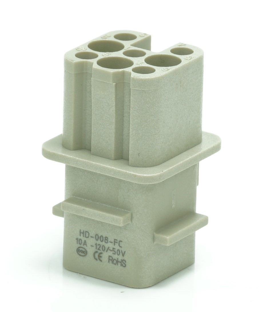 This is Heavy Duty Power Connector Insert 8 contacts 10A Female manufactured by RS PRO. The manufacturer part number is 208-4345. The product has a current rating of 10a. Moreover, the product has a nominal 42v/120v voltage rating. In addition, female is the available "Gender" of the product. It has straight body orientation. While the pole has 8 format. It features rs-hd range. The high-quality silver is used as contact plating material. The product rs-hd, is a highly preferred choice for users. The product is highly suitable for rs pro 10a crimps. The product contains 8 contacts. It comes in connector insert configuration. The product is made from sturdy copper alloy materials.