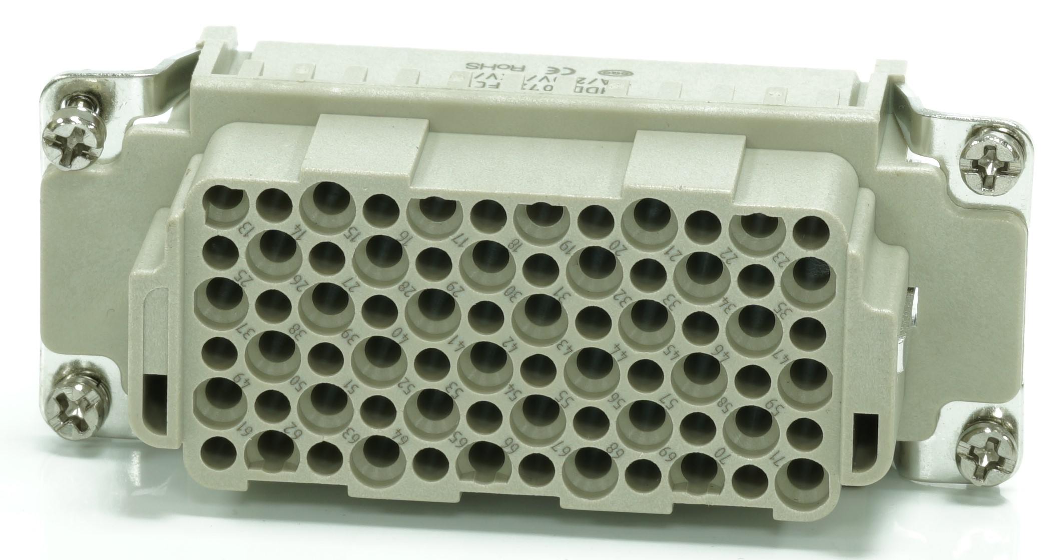 This is Heavy Duty Power Connector Insert 72 contacts 10A Female manufactured by RS PRO. The manufacturer part number is 208-4368. The product has a current rating of 10a. Moreover, the product has a nominal 250v voltage rating. In addition, female is the available "Gender" of the product. It has straight body orientation. While the pole has 72 format. It features rs-hdd range. The high-quality silver is used as contact plating material. The product rs-hdd, is a highly preferred choice for users. The product is highly suitable for rs pro 10a crimps. The product contains 72 contacts. It comes in connector insert configuration. The product is made from sturdy copper alloy materials.
