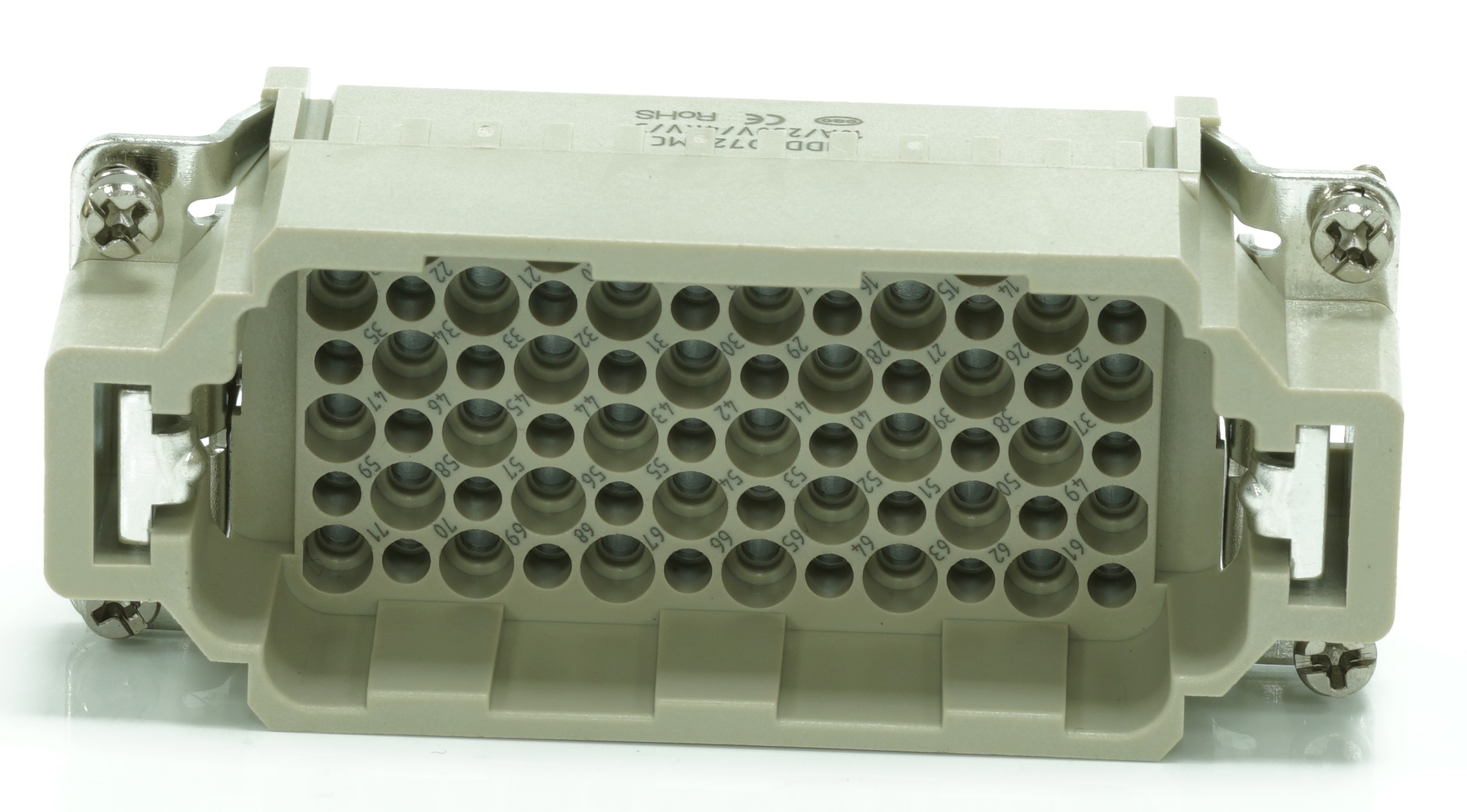This is Heavy Duty Power Connector Insert 72 contacts 10A Male manufactured by RS PRO. The manufacturer part number is 208-4370. The product has a current rating of 10a. Moreover, the product has a nominal 250v voltage rating. In addition, male is the available "Gender" of the product. It has straight body orientation. While the pole has 72 format. It features rs-hdd range. The high-quality silver is used as contact plating material. The product rs-hdd, is a highly preferred choice for users. The product is highly suitable for rs pro 10a crimps. The product contains 72 contacts. It comes in connector insert configuration. The product is made from sturdy copper alloy materials.