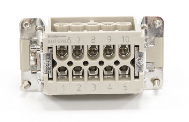 This is Heavy Duty Power Connector Insert 10 contacts 16A Female manufactured by RS PRO. The manufacturer part number is 208-4492. On the other hand, the wire has 0.14mm² of minimum size. The product has a current rating of 16a. The wire has a maximum size of 2.5mm². Moreover, the product has a nominal 500v voltage rating. In addition, female is the available "Gender" of the product. It has straight body orientation. While the pole has 10 format. It features rs-he range. The high-quality silver is used as contact plating material. The product rs-he, is a highly preferred choice for users. The product is highly suitable for heavy duty power connectors. The product contains 10 contacts. It comes in connector insert configuration. The product is made from sturdy copper alloy materials.