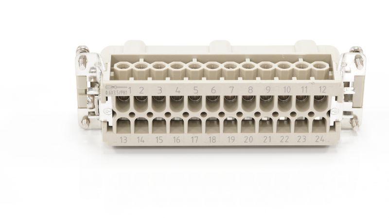 This is Heavy Duty Power Connector Insert 24 contacts 16A Male manufactured by RS PRO. The manufacturer part number is 208-4509. On the other hand, the wire has 0.14mm² of minimum size. The product has a current rating of 16a. The wire has a maximum size of 2.5mm². Moreover, the product has a nominal 500v voltage rating. In addition, male is the available "Gender" of the product. It has straight body orientation. While the pole has 24 format. It features rs-he range. The high-quality silver is used as contact plating material. The product rs-he, is a highly preferred choice for users. The product is highly suitable for heavy duty power connectors. The product contains 24 contacts. It comes in connector insert configuration. The product is made from sturdy copper alloy materials.