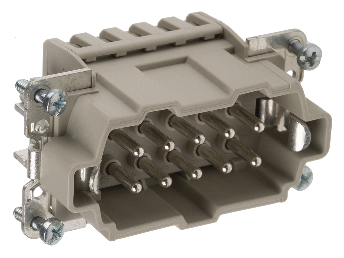 This is Heavy Duty Power Connector Insert 16A Male H-BE Series 10 Contacts manufactured by EPIC. The manufacturer part number is 10400100. The product has a current rating of 16a. The product is available in cable mount configuration. Moreover, the product has a nominal 600 v voltage rating. In addition, male is the available "Gender" of the product. It has straight body orientation. While the pole has 10p format. It comes in 2 of rows. The high-quality silver is used as contact plating material. The product h-be, is a highly preferred choice for users. The product contains 10 contacts. It comes in connector insert configuration. The product is made from sturdy copper alloy materials.
