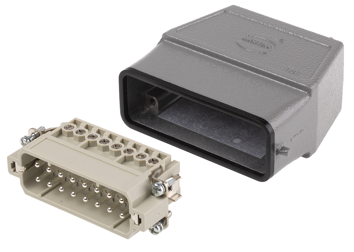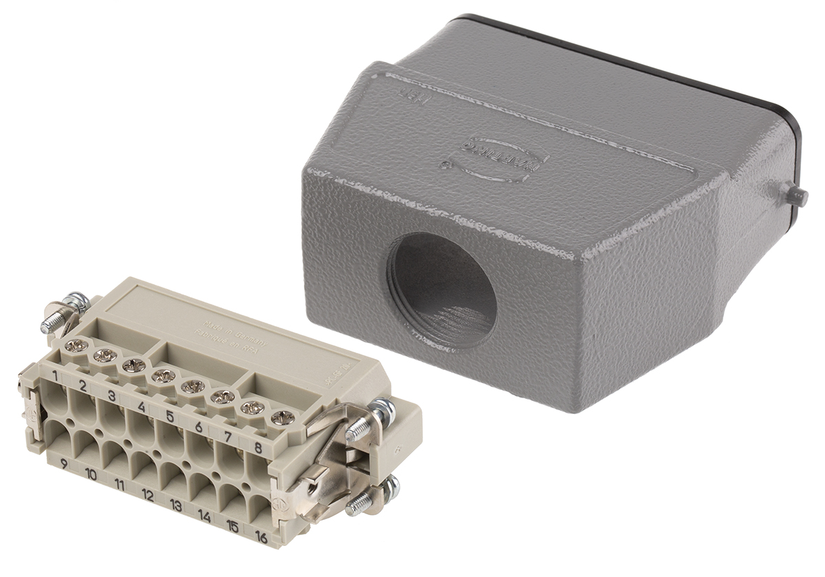 The Harting 09200162612+19200160446 is a robust connector set designed for heavy-duty power and signal connections in industrial environments. This kit includes both the male insert and the necessary top entry hood to form a reliable 16-way connection system. Engineered for professional use, this connector is rated for 16A current and 250 V voltage, providing a secure, durable interface for machinery, control panels, and automation equipment where reliable, high-integrity connections are paramount.