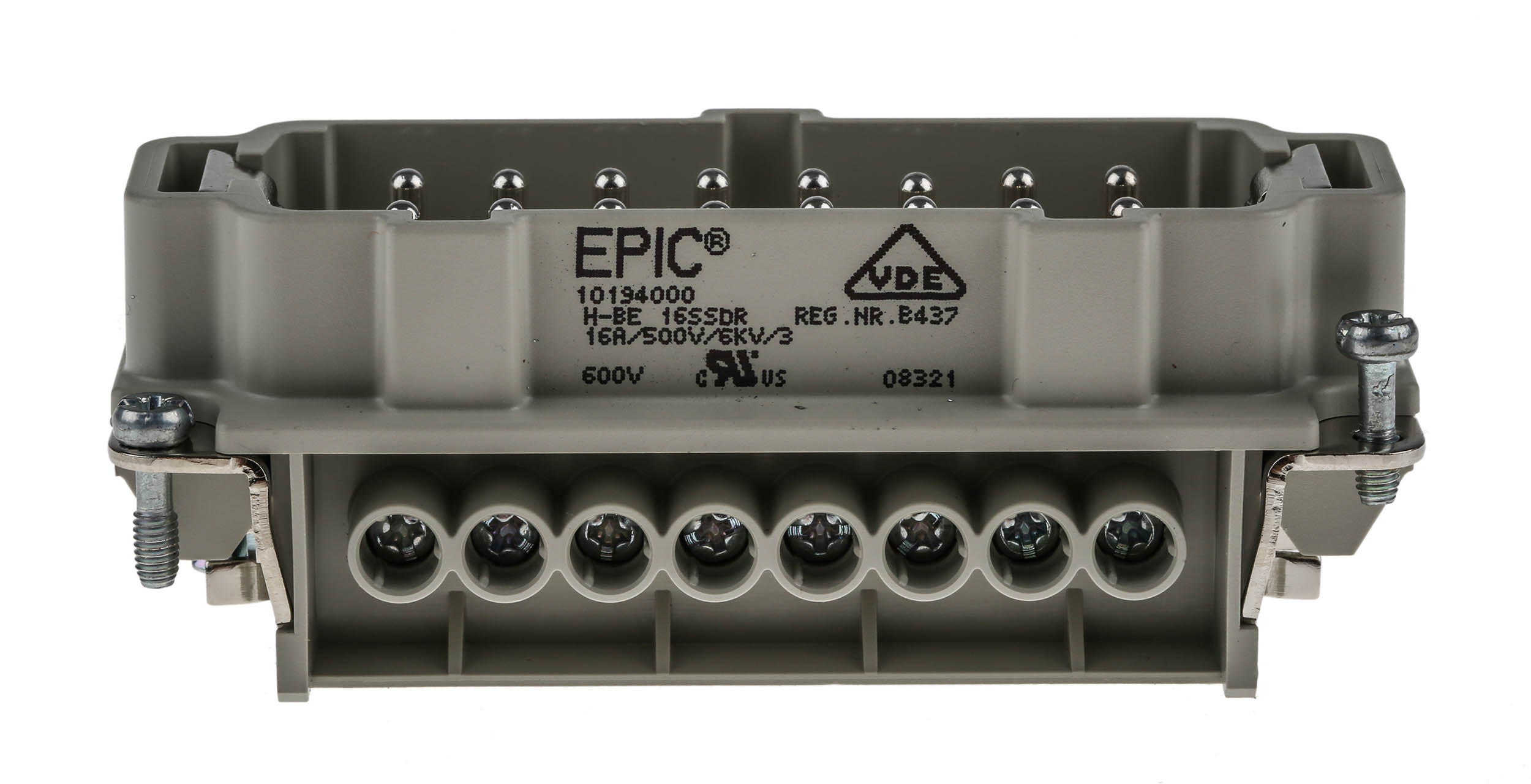 This is H-BE Series Cable Mount Connector Insert Male 16 Way 16A 600 V manufactured by Epic Contact. The manufacturer part number is 10194000. The product has a current rating of 16a. The product is available in cable mount configuration. It is IP rated with ip65. In addition, male is the available "Gender" of the product. It has straight body orientation. Moreover, the product has a nominal 600 v voltage rating. While the pole has 16p format. It allows screw down termination method. It comes in 2 of rows. The high-quality silver is used as contact plating material. The product h-be, is a highly preferred choice for users. The product contains 16 contacts. It comes in connector insert configuration. The product is made from sturdy copper alloy materials.