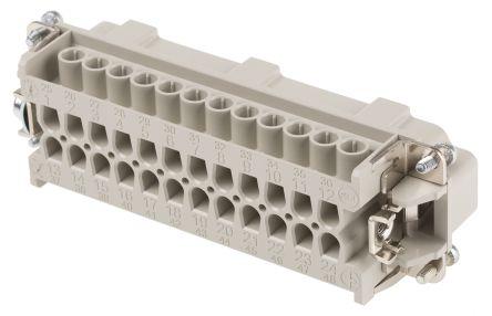 This is H-BE Series Cable Mount Connector Insert Female 24 Way 16A 600 V manufactured by Epic Contact. The manufacturer part number is 10186000. The product has a current rating of 16a. The product is available in cable mount configuration. Moreover, the product has a nominal 600 v voltage rating. In addition, male is the available "Gender" of the product. It has straight body orientation. It allows crimp termination method. It comes in 2 of rows. The product h-be, is a highly preferred choice for users. The product contains 24 contacts. It comes in connector insert configuration.