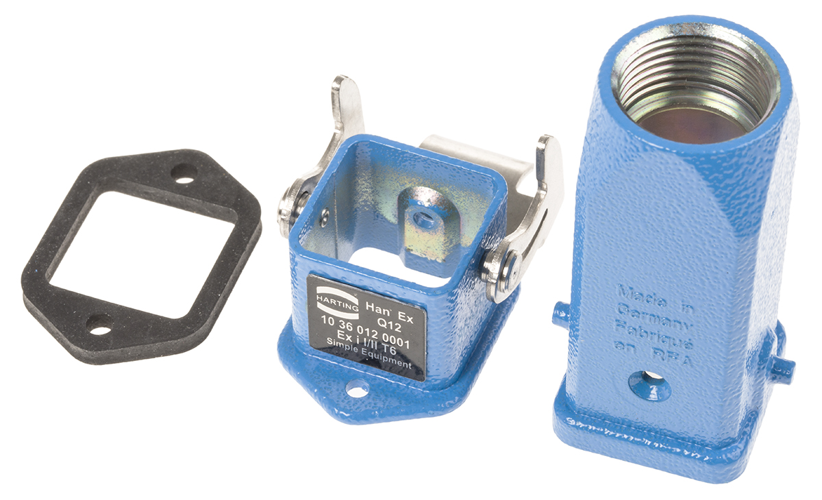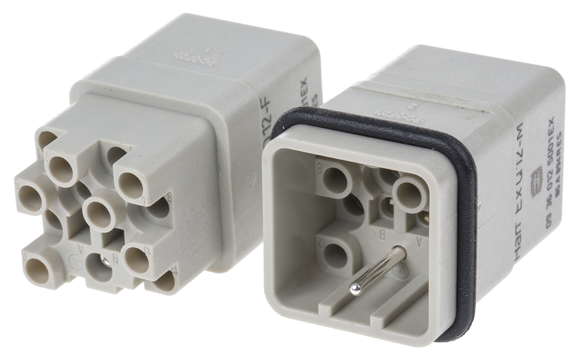 This is Han Ex Series 12 Way Male/Female Connector Kit includes Hood Housing Insert manufactured by Harting. The manufacturer part number is 10 36 012 0001. The product has a current rating of 10a. Moreover, the product has a nominal 90 v voltage rating. In addition, female to male is the available "Gender" of the product. Whereas, the 3 a is the manufacture's size code. It features han ex q12 range. The product han ex, is a highly preferred choice for users. The product contains 12 contacts. It comes in connector set configuration.