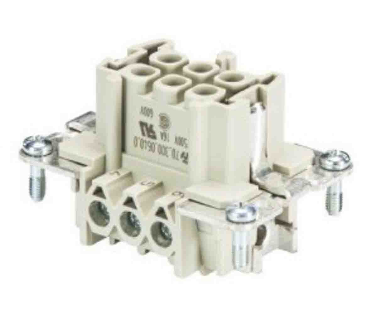 This is revos Socket insert 6 pole + earth scr manufactured by Wieland. The manufacturer part number is 70.300.0640.0. The product has a current rating of 16a. The product is available in panel mount configuration. Moreover, the product has a nominal 500 v voltage rating. In addition, female is the available "Gender" of the product. It has straight body orientation. Whereas, the 6 is the manufacture's size code. The product bas bus, is a highly preferred choice for users. The product contains 6 contacts. It comes in female insert configuration. It carries [Serial Number] serial number.
