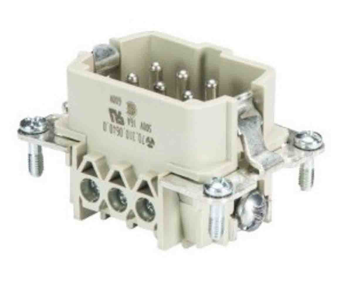 This is revos Plug insert 6 pole + earth screw manufactured by Wieland. The manufacturer part number is 70.310.0640.0. The product has a current rating of 16a. The product is available in panel mount configuration. Moreover, the product has a nominal 500 v voltage rating. In addition, male is the available "Gender" of the product. It has straight body orientation. Whereas, the 6 is the manufacture's size code. The product bas sts, is a highly preferred choice for users. The product contains 6 contacts. It comes in male insert configuration. It carries [Serial Number] serial number.
