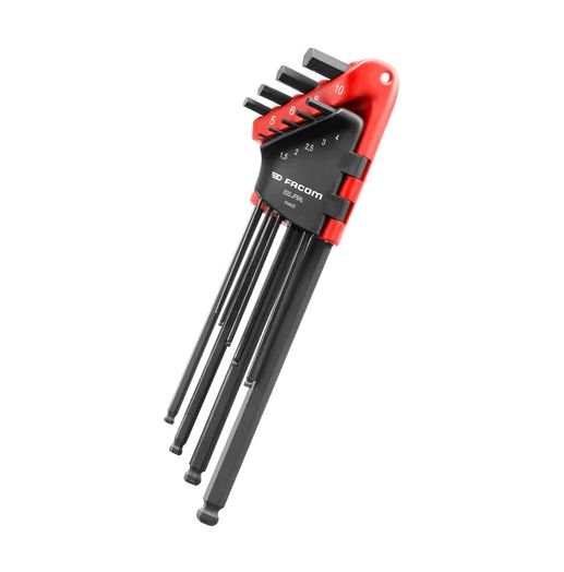 This is L Shape Long Arm Hex Key Set 9 pieces manufactured by Facom. The manufacturer part number is 83S.JP9AL. It is available in metric package. A quality product with a nice phosphate finish. The product is made from highly stable and reliable silicon steel. It has a model number 83s.jp9al. The built-in exquisite tip is a hexagon tip. It is a l product with unique specifications. hex key set is a versatile product designed to provide user-defined applications. Its hex key size is about 1.5 - 2 - 2.5 - 3 - 4 - 5 - 6 - 8 - 10mm . Additionally, it has a extra long arm . The product consists of 9 pieces.