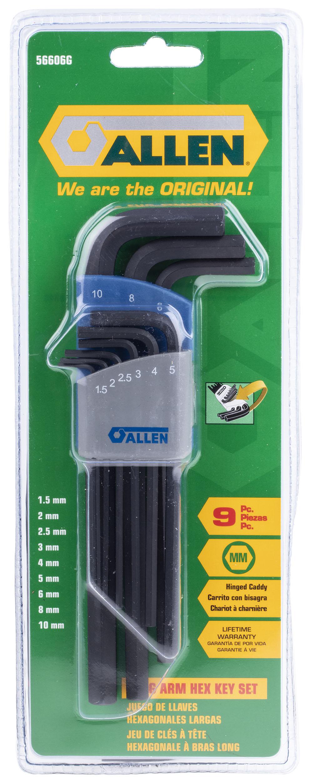 This is L Shape Long Arm Hex Key Set 9 pieces Alloy Steel manufactured by Allen. The manufacturer part number is 56606G. It is available in metric package. It has a hexagon type hex key . The product is made from highly stable and reliable steel. It is a l product with unique specifications. Its hex key size is about 1.5 mm, 2.0 mm, 2.5 mm, 3.0 mm, 4.0 mm, 5.0 mm, 6.0 mm, 8.0mm . Additionally, it has a long arm . The product consists of 9 pieces.