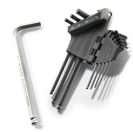 This is L Shape Long Arm Hex Key Set 9 pieces manufactured by Facom. The manufacturer part number is 83SH.JP9A100Y. It is available in metric package. It has a ball end type hex key . It is a l product with unique specifications. Its hex key size is about 1.5 mm, 2.0 mm, 2.5 mm, 3.0 mm, 4.0 mm, 5.0 mm, 6.0 mm, 8.0 mm, 10.0mm . Additionally, it has a long arm . The product consists of 9 pieces.