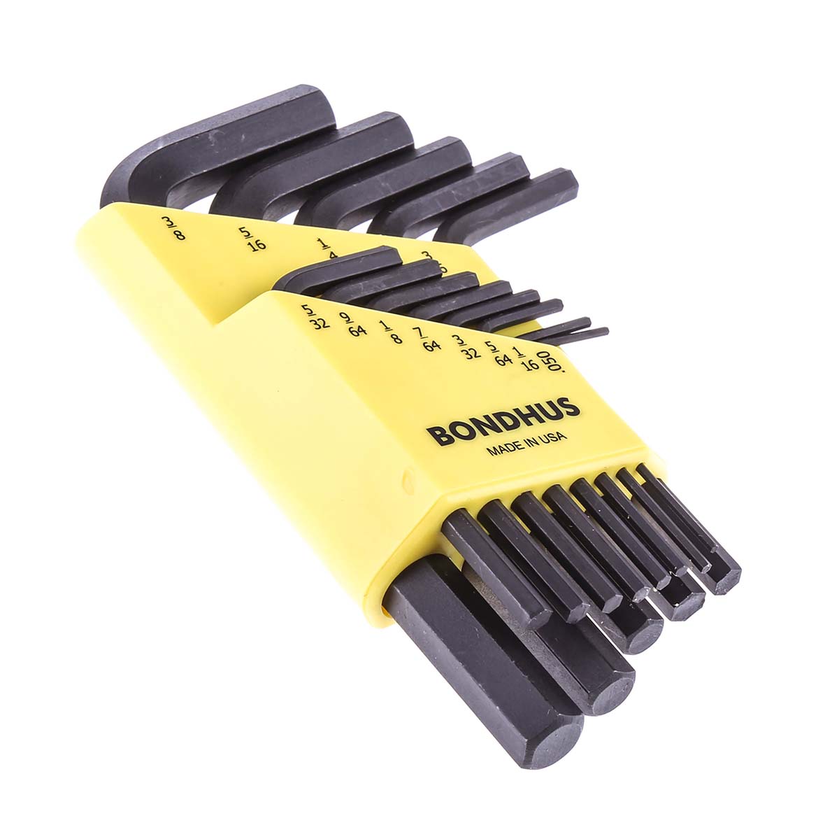 This is Hex Key Sets - Standard manufactured by Bondhus. The manufacturer part number is HLX13S. It is available in imperial package. A quality product with a nice black finish. The product is made from highly stable and reliable steel. The built-in exquisite tip is a hexagon tip. It is a l product with unique specifications. hex key set is a versatile product designed to provide user-defined applications. Its hex key size is about 0.05 → 3/8" . Additionally, it has a short arm . The product consists of 13 pieces.