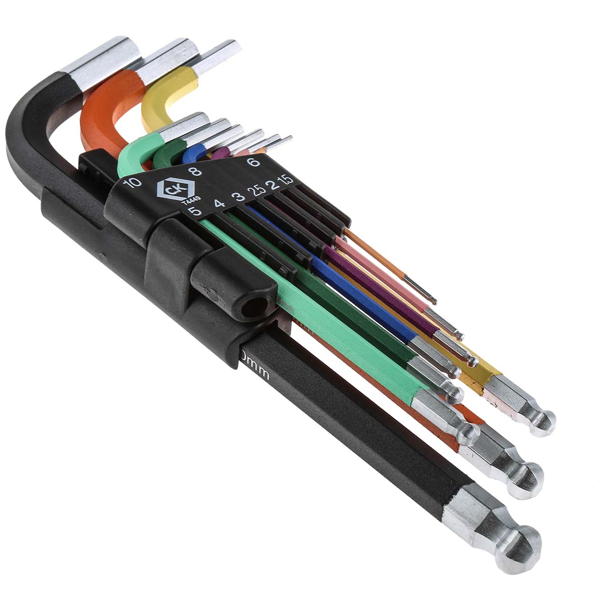 This is C.K Coloured Ball End Hexagon Key Clip S manufactured by CK. The manufacturer part number is T4449. It is available in metric package. Its hex key size is about 1.5 mm, 2.0 mm, 2.5 mm, 3.0 mm, 4.0 mm, 5.0 mm, 6.0 mm, 8.0 mm, 10.0mm . It is a l product with unique specifications. hex key set is a versatile product designed to provide user-defined applications. The built-in exquisite tip is a ball end hexagon tip. The product consists of 9 pieces.