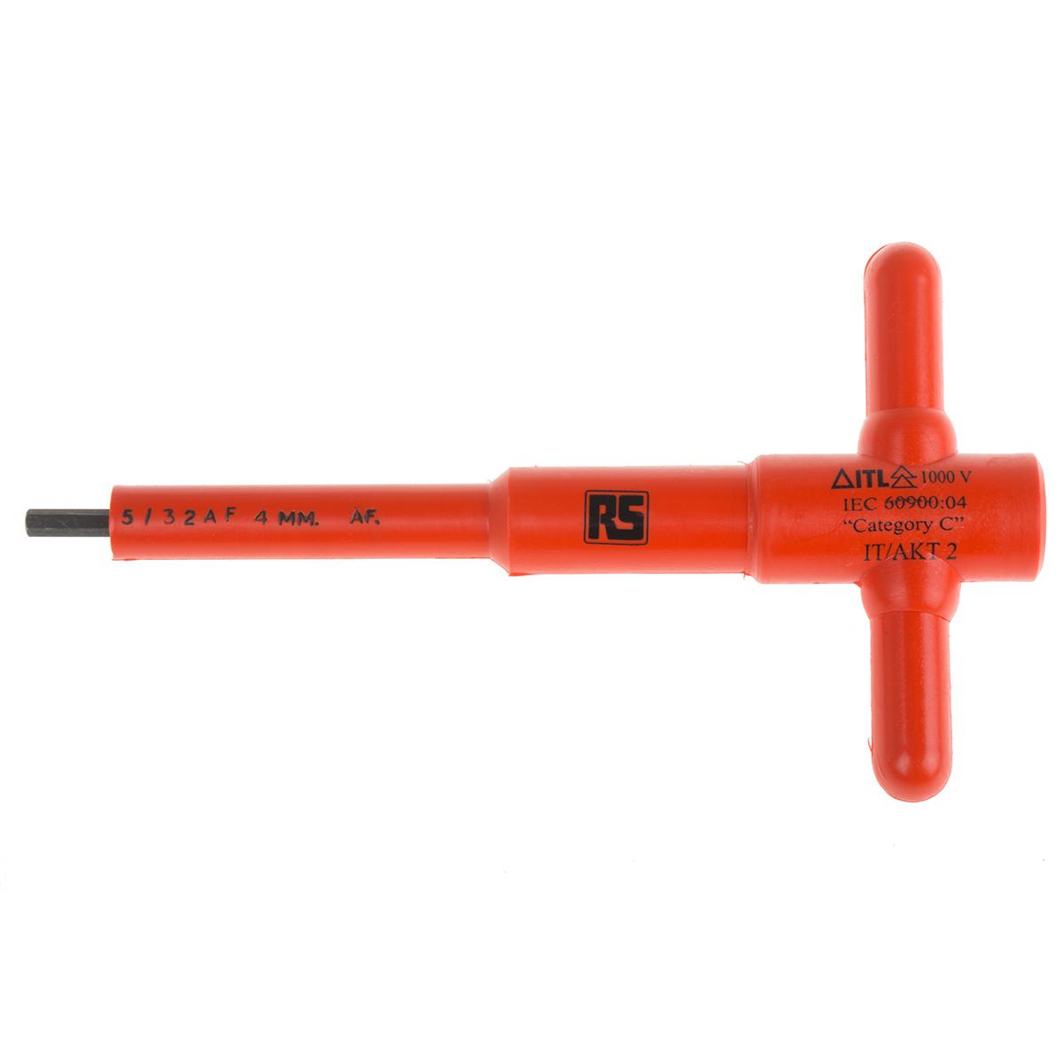 This is Hex Key T Shape 5/32in manufactured by ITL Insulated Tools Ltd. The manufacturer part number is RS_911-1386. It is available in metric package. VDE/1000V Approval Options - yes. It has a hexagon type hex key . The product is made from highly stable and reliable chrome vanadium steel. It is a t product with unique specifications. Its hex key size is about 5/32in . Additionally, it has a long arm .