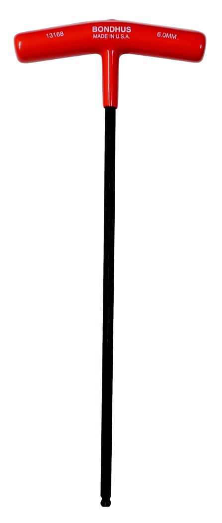 This is Hex Key T-handle 6mm manufactured by Bondhus. The manufacturer part number is 13168. It is available in metric package. Its hex key size is about 6mm . It is a t product with unique specifications. hex key is a versatile product designed to provide user-defined applications. The built-in exquisite tip is a ball end hexagon tip. The product consists of 1 pieces.