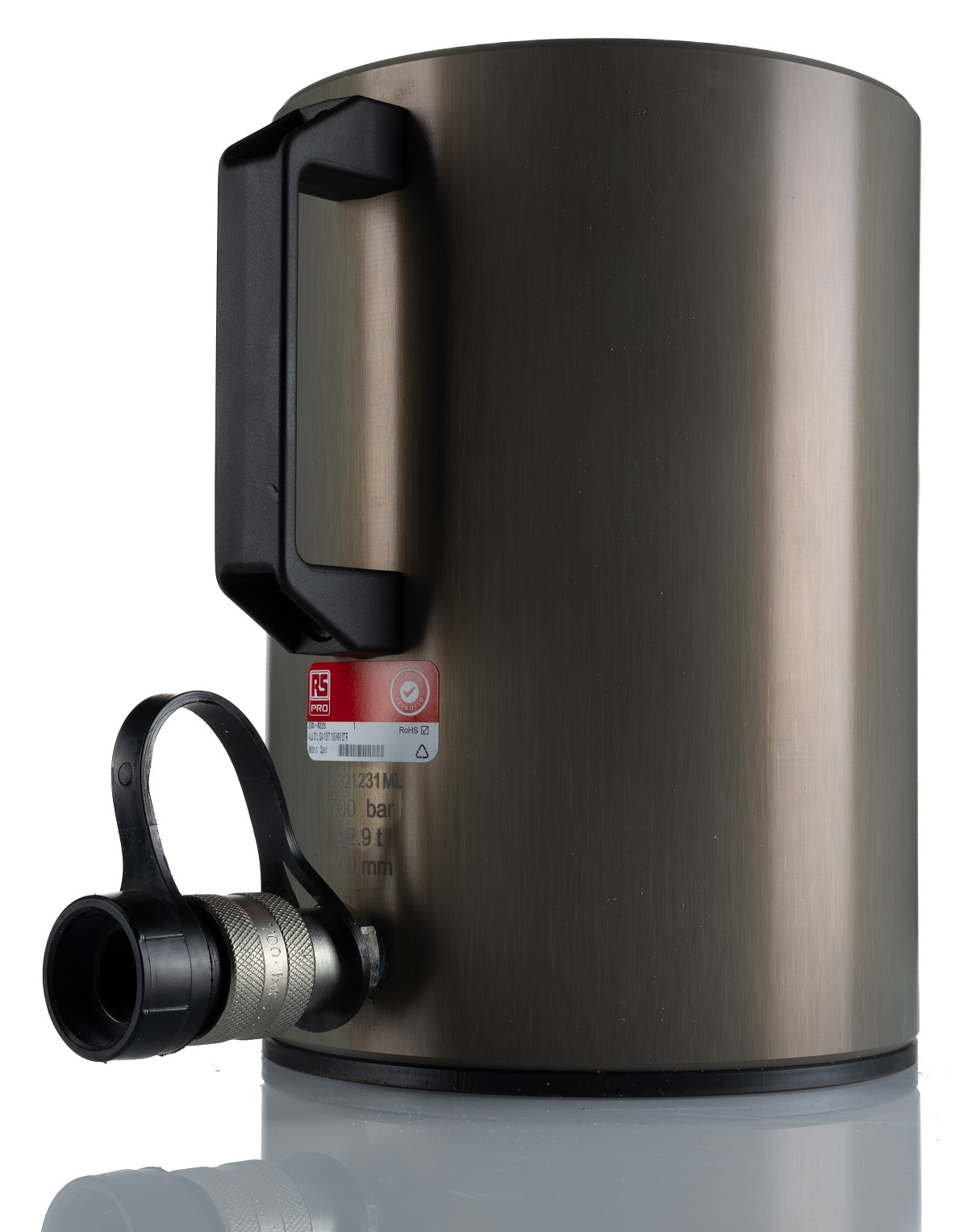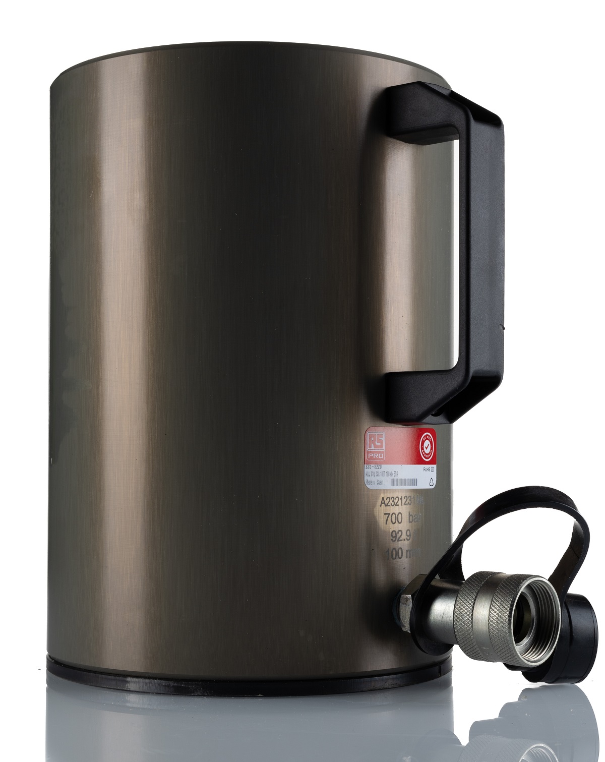 This is Single Portable General Purpose Hydraulic Cylinder 100t 100mm stroke manufactured by RS PRO. The manufacturer part number is 235-8220. It allows up to 1326cm³ oil capacity. The module has the capacity of 100t. It features 700bar maximum operating pressure. The typical product's weight is 19kg. It has a cylinder effective area of 133cm² . It has about 360mm extended height . The stroke is 100mm. It has about 260mm closed height . The product has 180mm external diameter. It has a single acting feature .