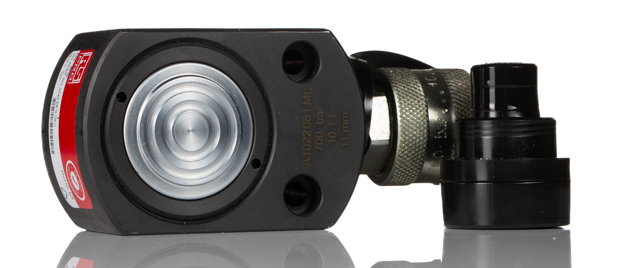 This is Single Portable Low Height Hydraulic Cylinder 10t 11mm stroke manufactured by RS PRO. The manufacturer part number is 235-8253. It allows up to 16cm³ oil capacity. The module has the capacity of 10t. It features 700bar maximum operating pressure. The typical product's weight is 1.6kg. It has a cylinder effective area of 15cm² . It has about 54mm extended height . The stroke is 11mm. It has about 43mm closed height . It has a single acting feature .