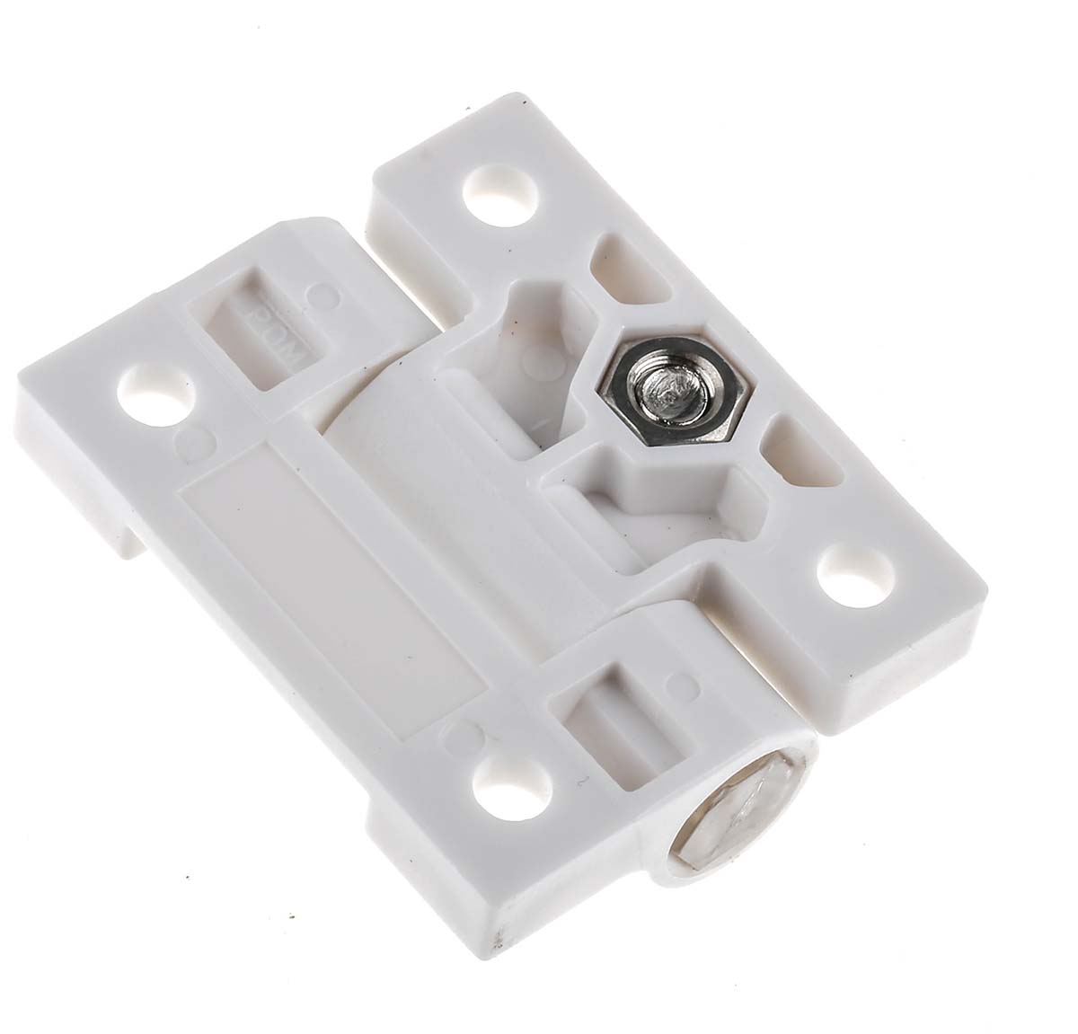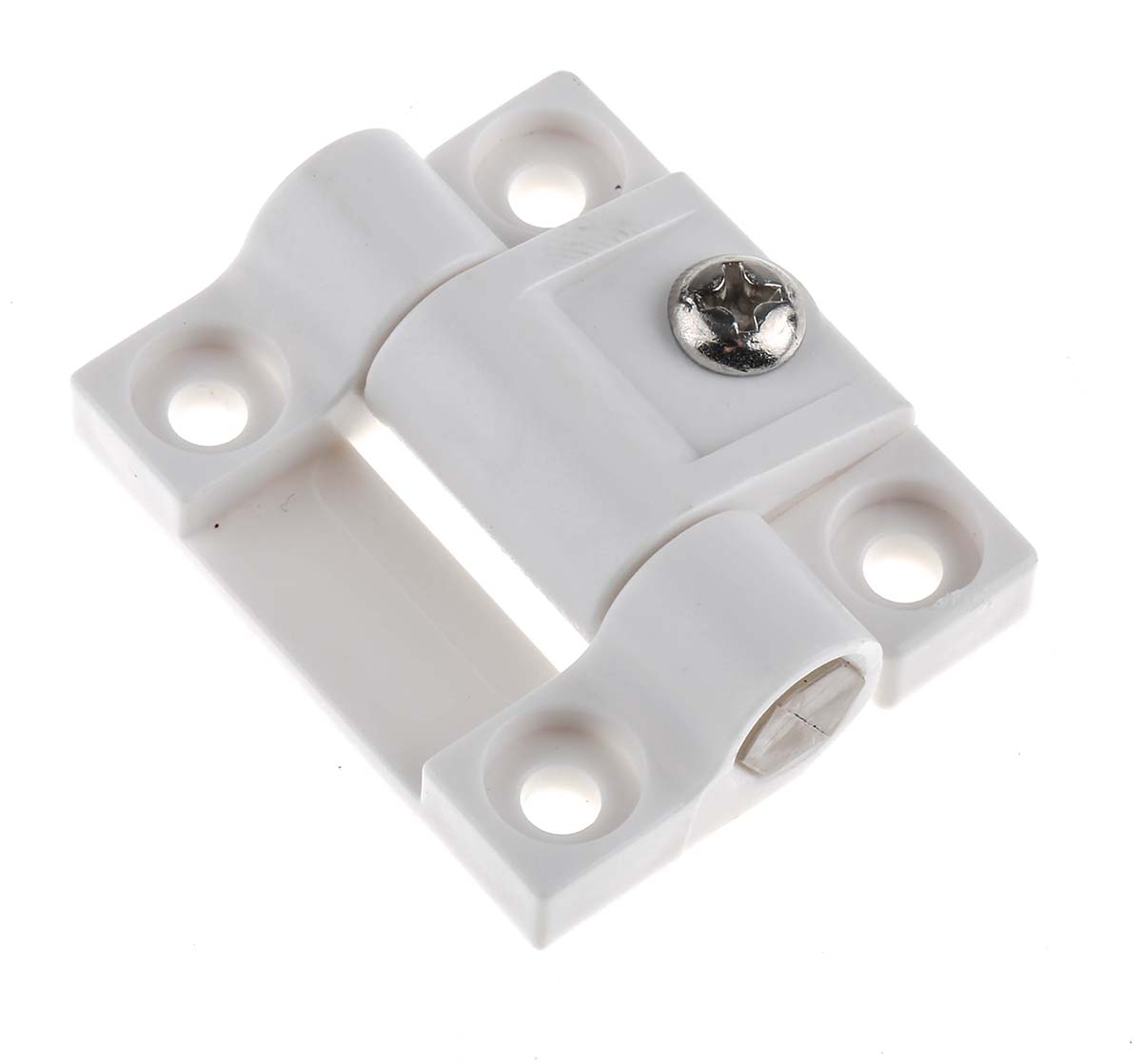 This is White Acetal Adjustable Hinge with a Fixed pin Screw 43mm x 36.5mm x 6mm manufactured by RS Pro. The manufacturer part number is 772-9638. Its closing type is free swinging . It is fixed using screw method . It has a friction hinge type hinge . It is 6mm thick. Furthermore, the product is 37mm wide. Its accurate length is 43mm.
