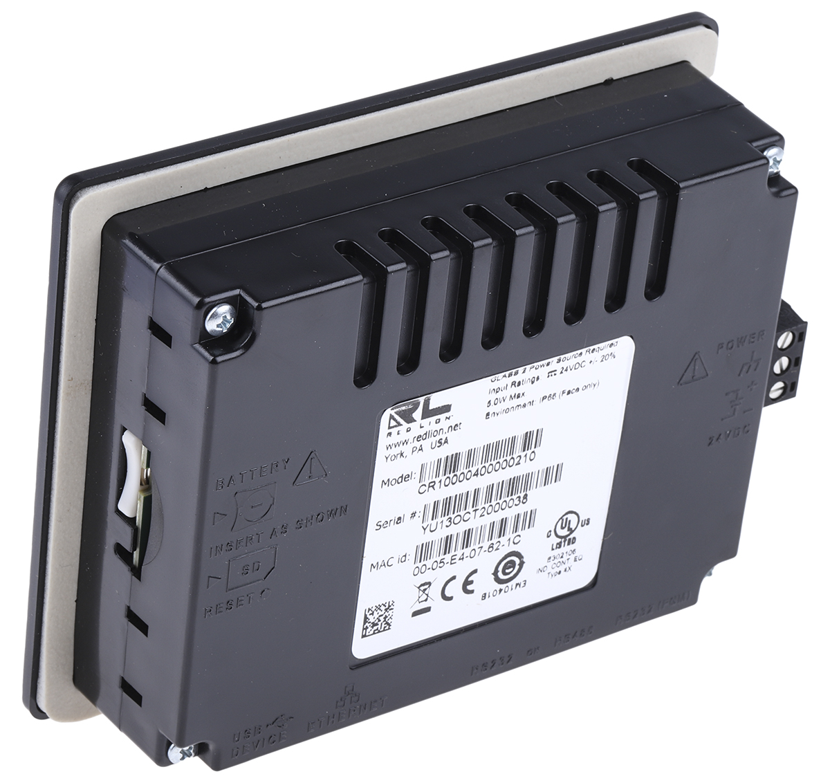This is Controls CR1000 Series Touch Screen HMI 4.3 in Color 480 x 272pixels manufactured by Red Lion. The manufacturer part number is CR10000400000210. It features a remarkable colour display screen display. This product features 4 number of ports. It is designed with 512mb onboard memory . It is IP rated with ip66. The product cr1000, is a highly preferred choice for users. It supports a/an ethernet, serial type port . Its accurate length is 130.65mm. The product is designed with a standard 480 x 272 pixel display resolution . The product is certified with no hazardous area certification. Furthermore, the product is 104.69 mm wide. The product comes in 38.1mm depth. It has a backlighting feature yes . Whereas, the minimum operating temperature of the product is -10°c. touch screen hmi is a versatile product designed to provide user-defined applications. It has a maximum operating temperature of 50°c. It has about 109.22mm diagonal display size .